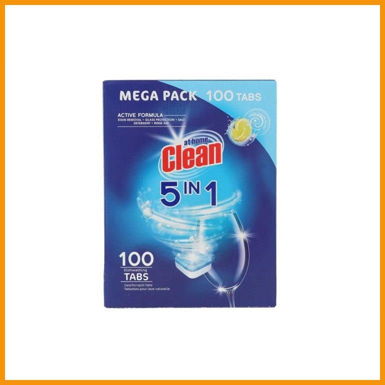 At Home Clean 5in1 -astianpesuainetabletit sisältävät kaiken tarvittavan astioiden puhdistamiseen: pesuaineen, lasinsuojan, suolan, huuhtelukirkasteen ja tehokkaat tahranpoistoaineet. Nauti puhtaista ja kirkkaista astioista jokaisen pesukerran jälkeen.Pakkauksessa on 100 tablettia.