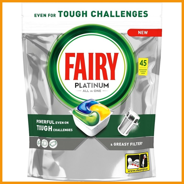 Fairy Platinum All in One -konetiskitabletit puhdistavat haastavimmankin lian jo ensimmäisellä pesukerralla. Lopputuloksena ovat niin hohtavan puhtaat astiat kuin rasvaton ja puhdas astianpesukonekin. Fairy Platinum yhdistää nesteen ja jauheen tehokkaaksi kapseliksi.Paketissa on 45 tablettia.