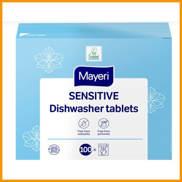 Mayeri Sensitive on hajusteeton ja väriaineeton konetiskitabletti, joka poistaa tehokkaasti rasvaa ja likaa kaikenkovuisissa vesissä ja sopii toimii myös lyhyissä pesuohjelmissa. Lasit, astiat ja ruokailuvälineet tulevat kiiltäviksi ja tahrattomiksi.Tuotteella on EU Ecolabel -ympäristösertifikaatti.