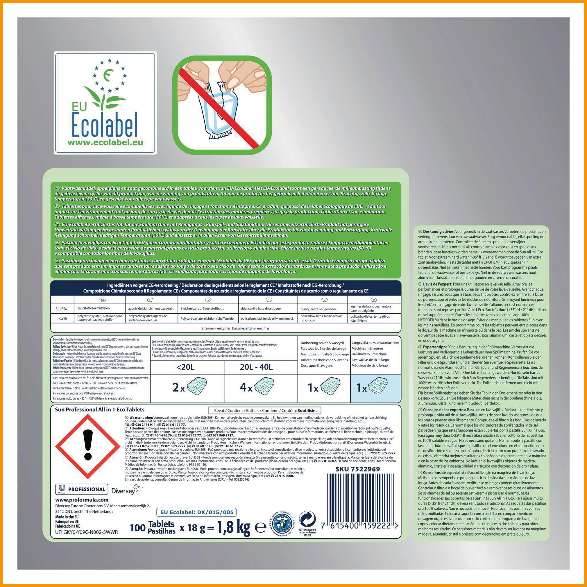 Sun Pro Formula Eco All-In-1 konetiskitabletti on hajusteeton ja sisältää kaiken tarvittavan - pesuaineen, huuhtelukirkasteen sekä suolan. Tehokkaasti pesevä konetiskitabletti on ympäristöystävällinen ja sille on myönnettu EU-ympäristömerkki. Ammattikäyttöön suunniteltu Pro Formula konetiskitabletti sopii käytettäväksi käsin annosteltavissa astianpesukoneissa, niin kotitalouksissa kuin pienlaitoksissa. Tabletti liukenee nopeasti veteen ja toimii kaikissa vesikovuuksissa, poistaen tehokkaasti valkuais- ja tärkkelyslian sekä esimerkiksi kahvitahrat. Hajusteeton Yksi pesutabletti sisältää kaiken (All-In-1) Ei tarvetta esihuuhtelulle Erinomainen pesutulos jo alhaisissa lämpötiloissa (50 °C) Soveltuu kotitalouksille ja ammattikäyttöön Sopii kaikenkovuisiin vesiin Vesiliukoinen pesutabletti Sun Pro Formula pH 11 EU-ympäristömerkki Yksi (1) pakkaus sisältää 100 tablettia.Konetiskitabletit toimitetaan 100 kappaleen erissä.