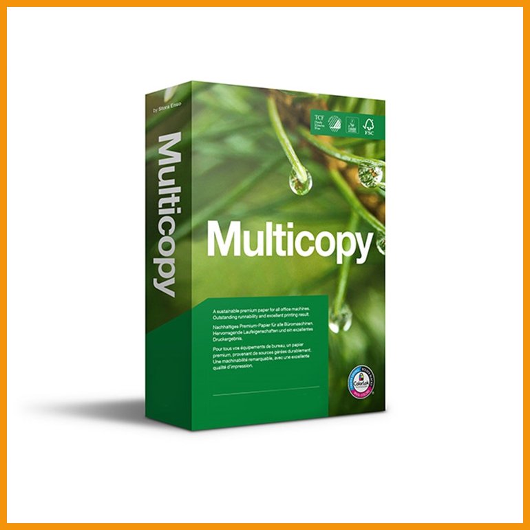 Hinta10,73€ / 500 kplMulticopy on kirkasvalkoinen monikäyttöpaperi joka sopii kaikkiin toimistolaitteisiin. sillä on erinomainen syöttöluotettavuus ja lopputulos erinomainen sekä väri- että mustavalkotulostuksessa. a4 on käytetyin paperikoko ja standardi monissa toimistoissa sekä kouluympäristöissä. arkkikoko: ...