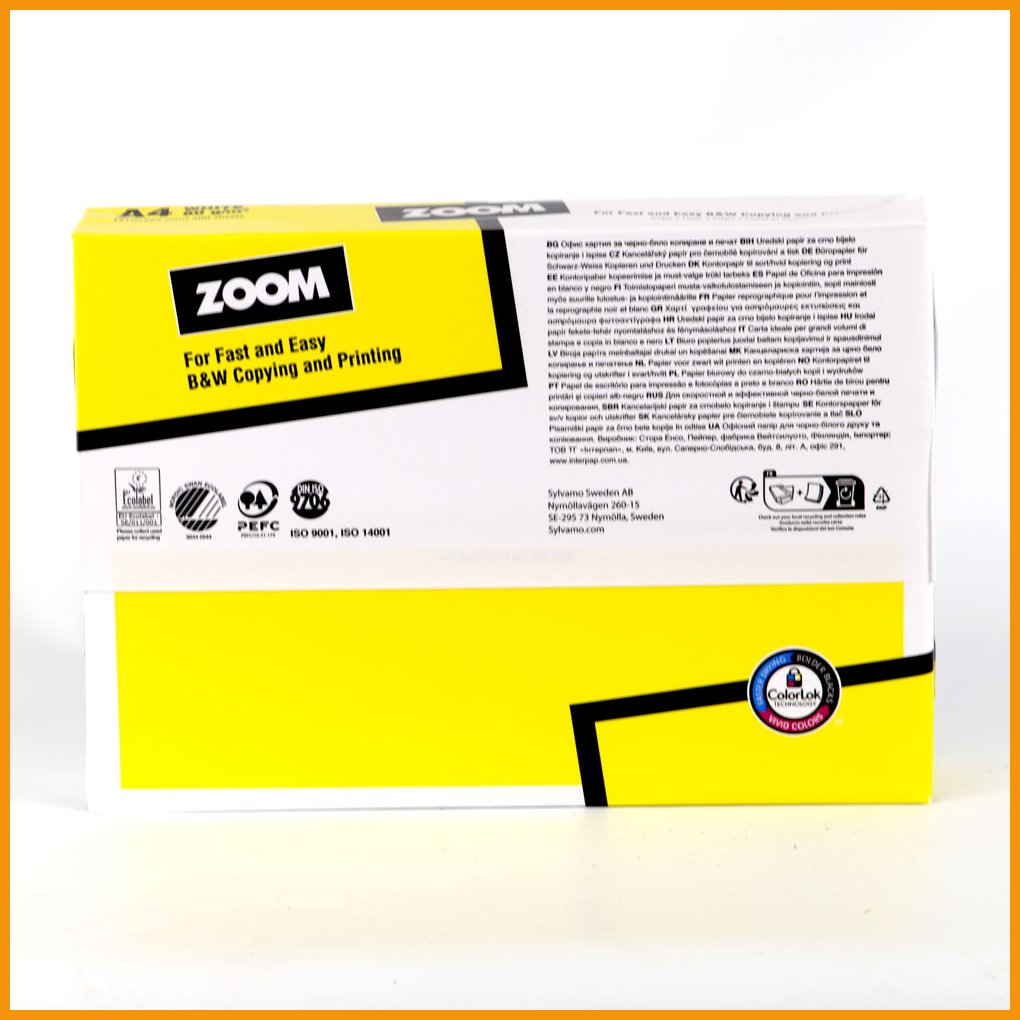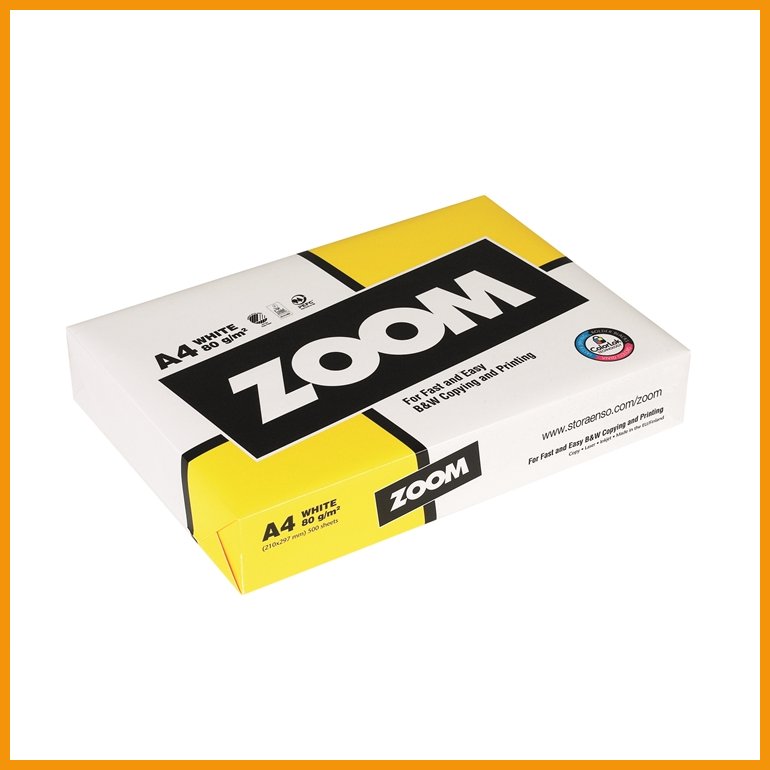 ZOOM-kopiopaperi on arkistokelpoinen ja soveltuu kopioimisen lisäksi mustavalkoiseen laser- ja mustesuihkutulostukseen. Paperilla on hyvä ajettavuus nopeissa toimistolaitteissa ja se sopii hyvin volyymikäyttöön. Tuotteella on myös värintoiston laadusta kertova ColorLok-hyväksyntä.PEFC-sertifioidusta kuidusta valmistetulla paperilla on EU Ecolabel -ympäristösertifikaatti ja pohjoismainen Joutsenmerkki.