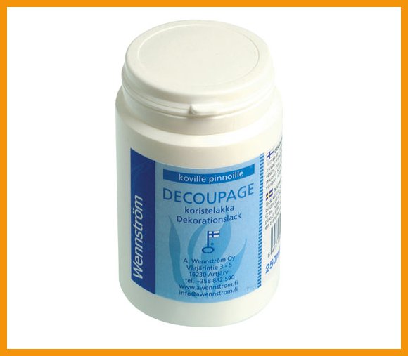 Wennström Decoupage on vesiohenteinen koristelakka kaikenlaisille koville pinnoille. Koristelakan avulla voit askarrella monipuolisesti, kuten kiinnittää leikattuja kuvia, päällystää laatikoita ja valmistaa paperipäällysteisiä tuotteita. Kuivuttuaan lakka muodostaa pinnalle värittömän kalvon.Kotimaisella tuotteella on Avainlippu-tunnus.