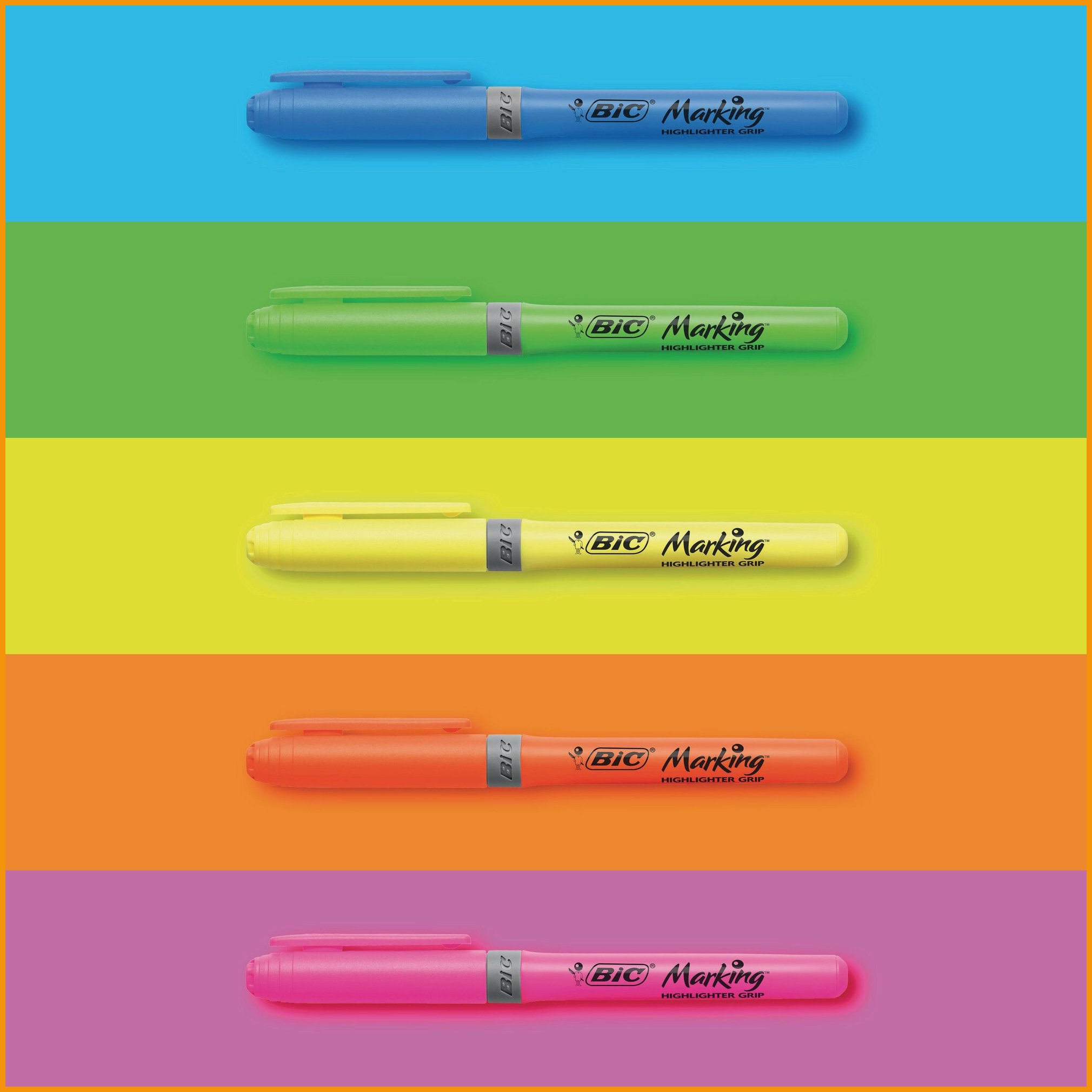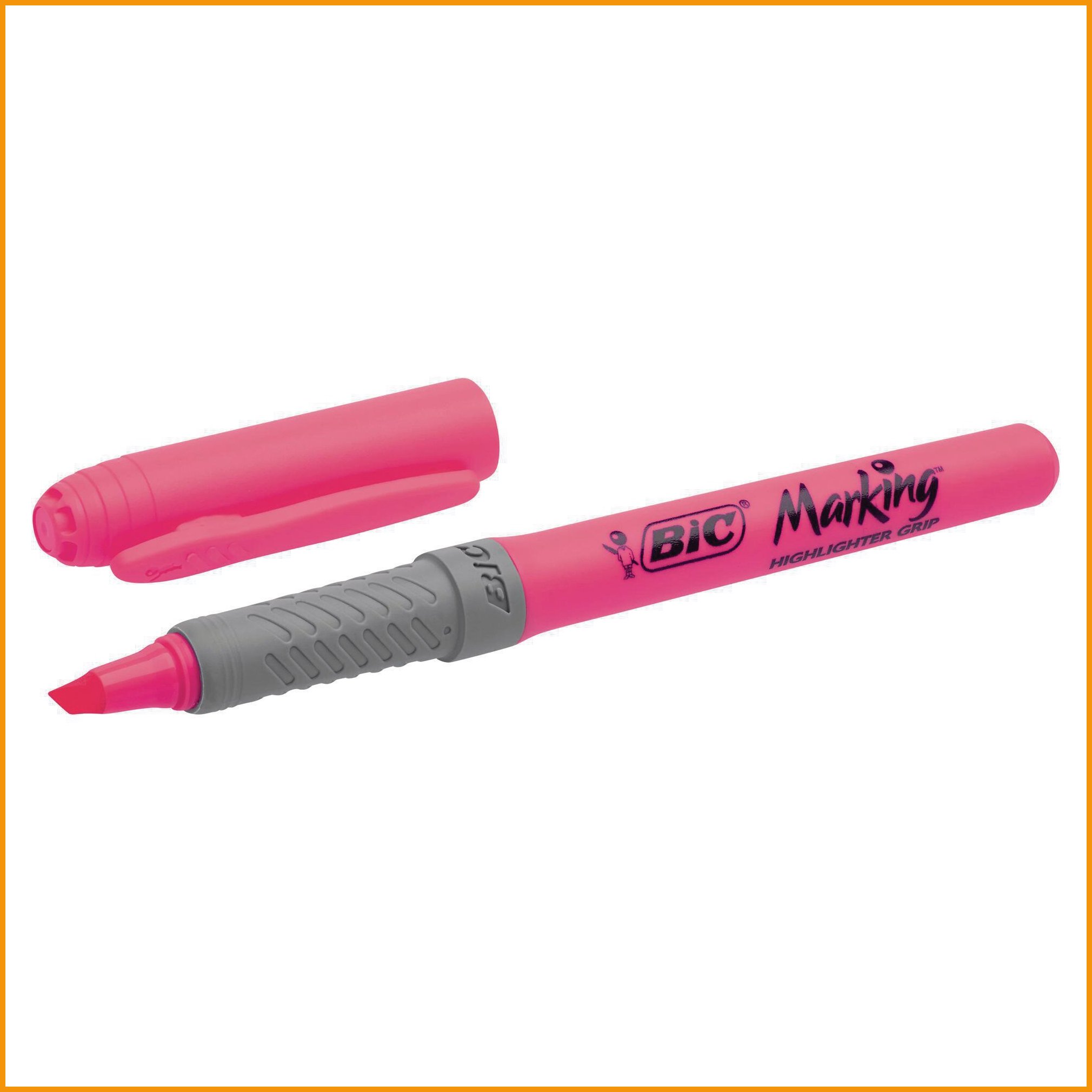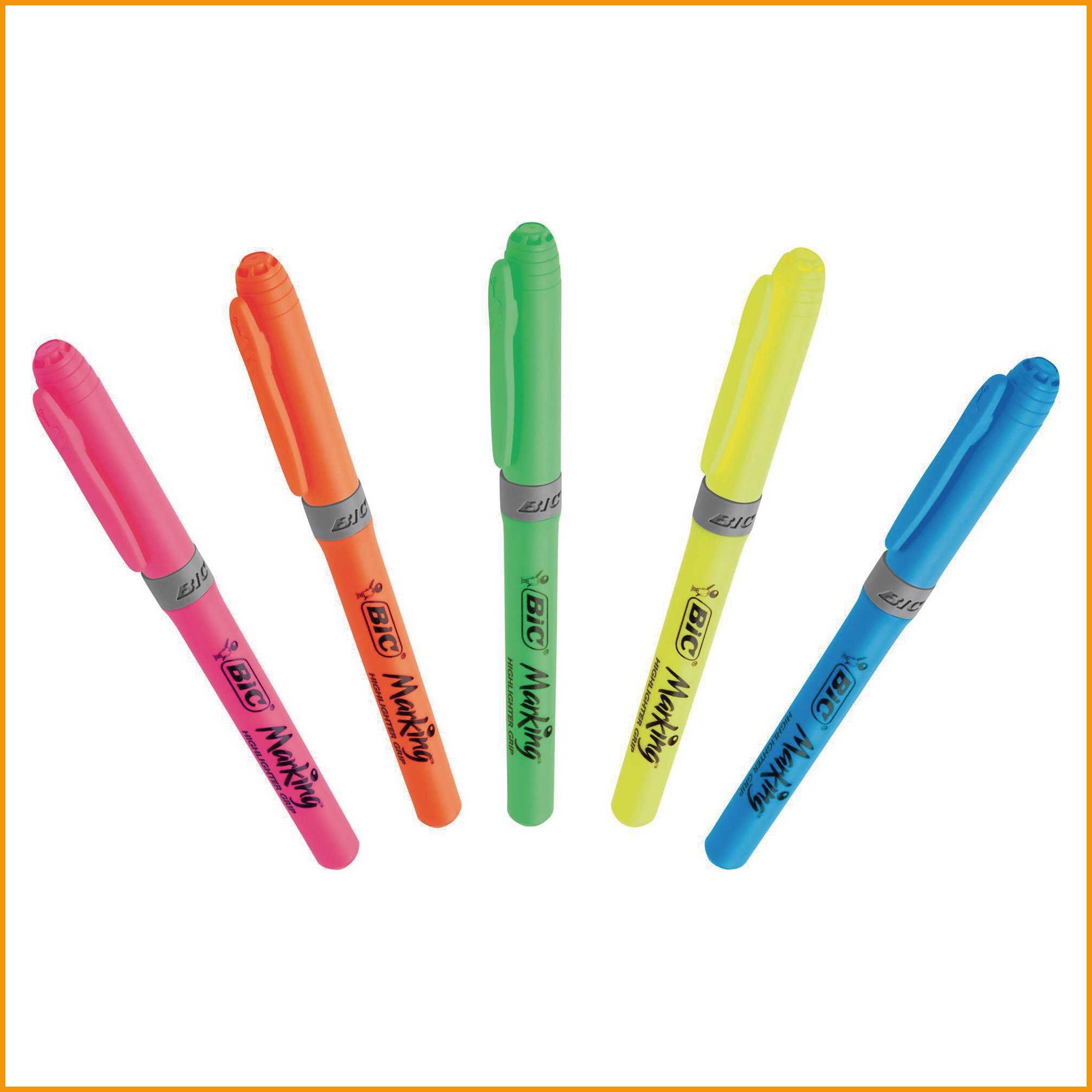 Kapeassa, ergonomisella kumiotteella varustetussa bic grip -korostuskynässä on erittäin kirkkaat värit. kynä sopii kaikille paperille, faxeille ja valokopiolle. musteen kuivumisesta ei tarvitse olla huolissaan: korkki voi olla auki 8 tuntia musteen kuivumatta. lajitelmassa on viisi eriväristä kynää: keltainen, pinkki, oranssi, vihreä ja sininen. viisto kärki, viivan leveys 1,6-3,3 mm. Korostuskynien minimitilaus 1 paketti = 5 kpl. Tukkupakkauksessa 12 kpl.Korostuskynät toimitetaan 5 kappaleen erissä.