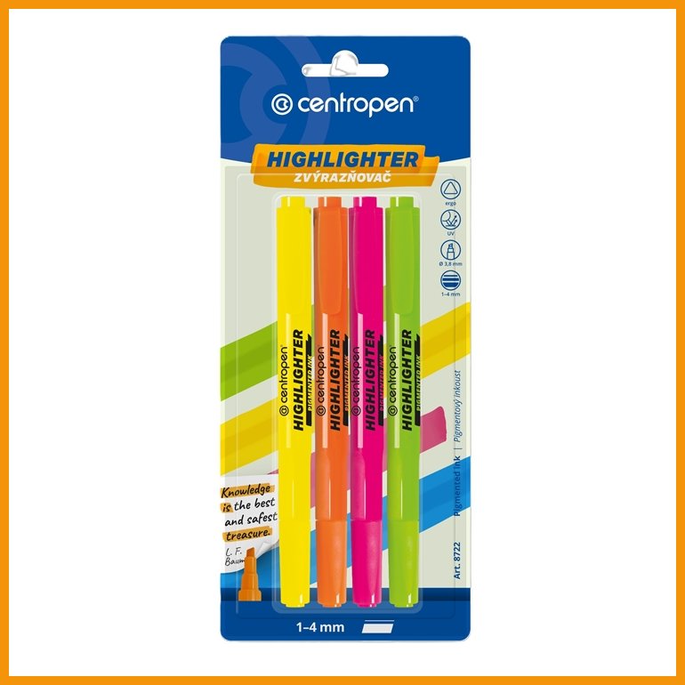 Centropen 8722 -korostuskynän vesipohjainen, myrkytön ja fluoresoiva pigmenttimuste soveltuu kaikenlaisten papereiden alleviivaamiseen ja korostamiseen. Muovisessa rungossa on kiinteä taskuklipsi.Musteen väri: keltainen, oranssi, pinkki ja vihreä