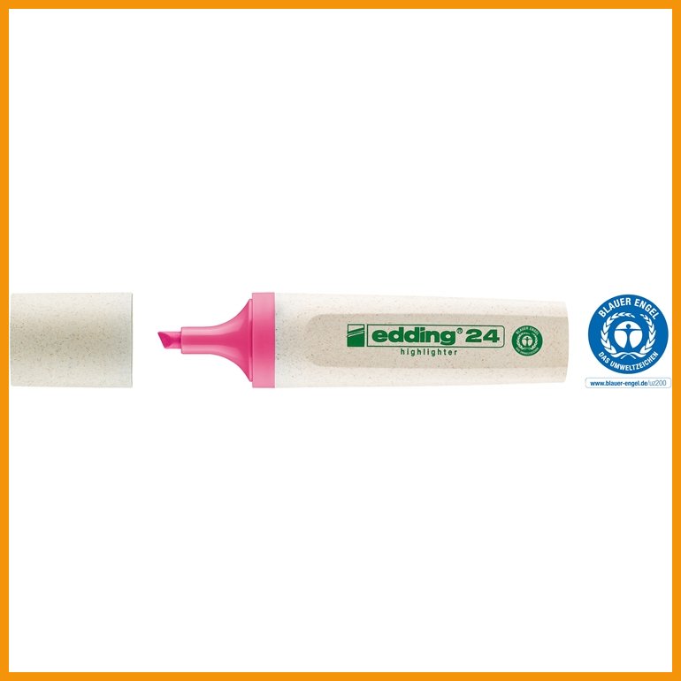 Edding 24 Ecoline pinkin korostuskynän muovinen runko, suukappale ja suojakorkki on valmistettu vähintään 90-prosenttisesti kierrätysmateriaaleista. Myös mustesäiliö voidaan täyttää uudelleen. Kynällä on osoituksena ekologisuudestaan Blue Angel -ympäristösertifikaatti. Vesiliukoinen ja valonkestävä muste tuottaa kirkkaat värit.Musteen väri: pinkki