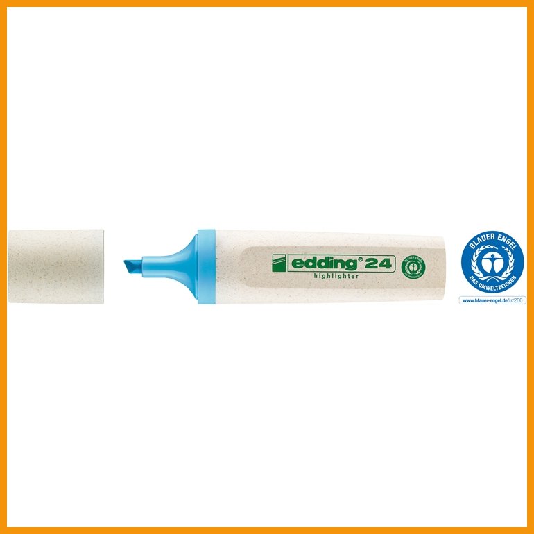 Edding 24 Ecoline -korostuskynän muovinen runko, suukappale ja suojakorkki on valmistettu vähintään 90-prosenttisesti kierrätysmateriaaleista. Myös mustesäiliö voidaan täyttää uudelleen. Kynällä on osoituksena ekologisuudestaan Blue Angel -ympäristösertifikaatti. Vesiliukoinen ja valonkestävä muste tuottaa kirkkaat värit.Musteen väri: vaaleansininen
