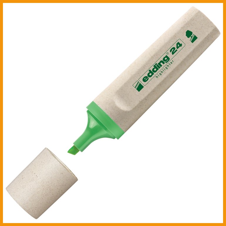 Edding 24 Ecoline -korostuskynän muovinen runko, suukappale ja suojakorkki on valmistettu vähintään 90-prosenttisesti kierrätysmateriaaleista. Myös mustesäiliö voidaan täyttää uudelleen. Kynällä on osoituksena ekologisuudestaan Blue Angel -ympäristösertifikaatti. Vesiliukoinen ja valonkestävä muste tuottaa kirkkaat värit.Musteen väri: vaaleanvihreä