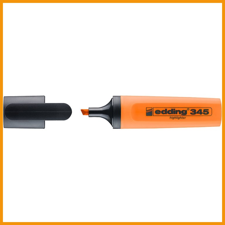Edding 345 oranssilla korostuskynällä alleviivaat ja korostat tekstin oleelliset kohdat. Vesipohjainen ja valonkestävä muste tuottaa kirkkaat värit ja toimii lähes kaikilla paperipinnoilla. Muste ei valu paperin läpi, ja mustesäiliö voidaan täyttää uudelleen. Korkissa on klipsi.Musteen väri: oranssi