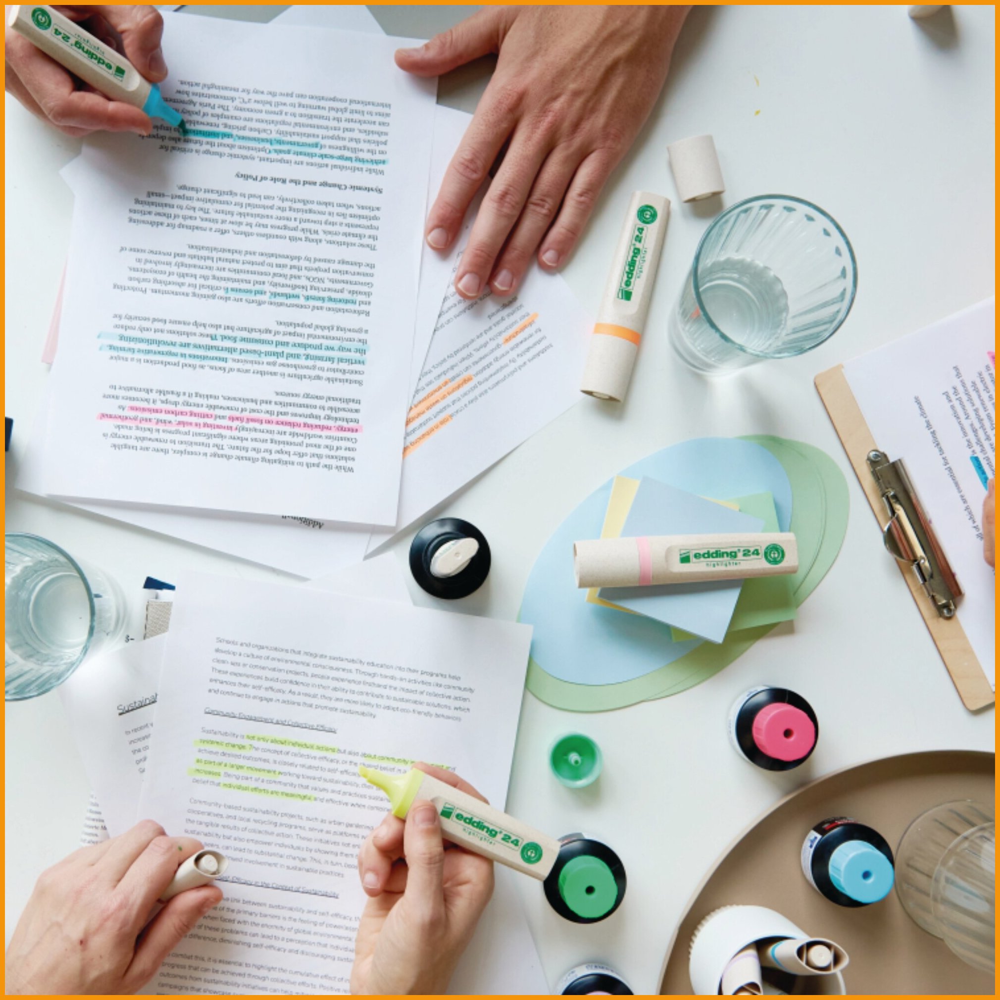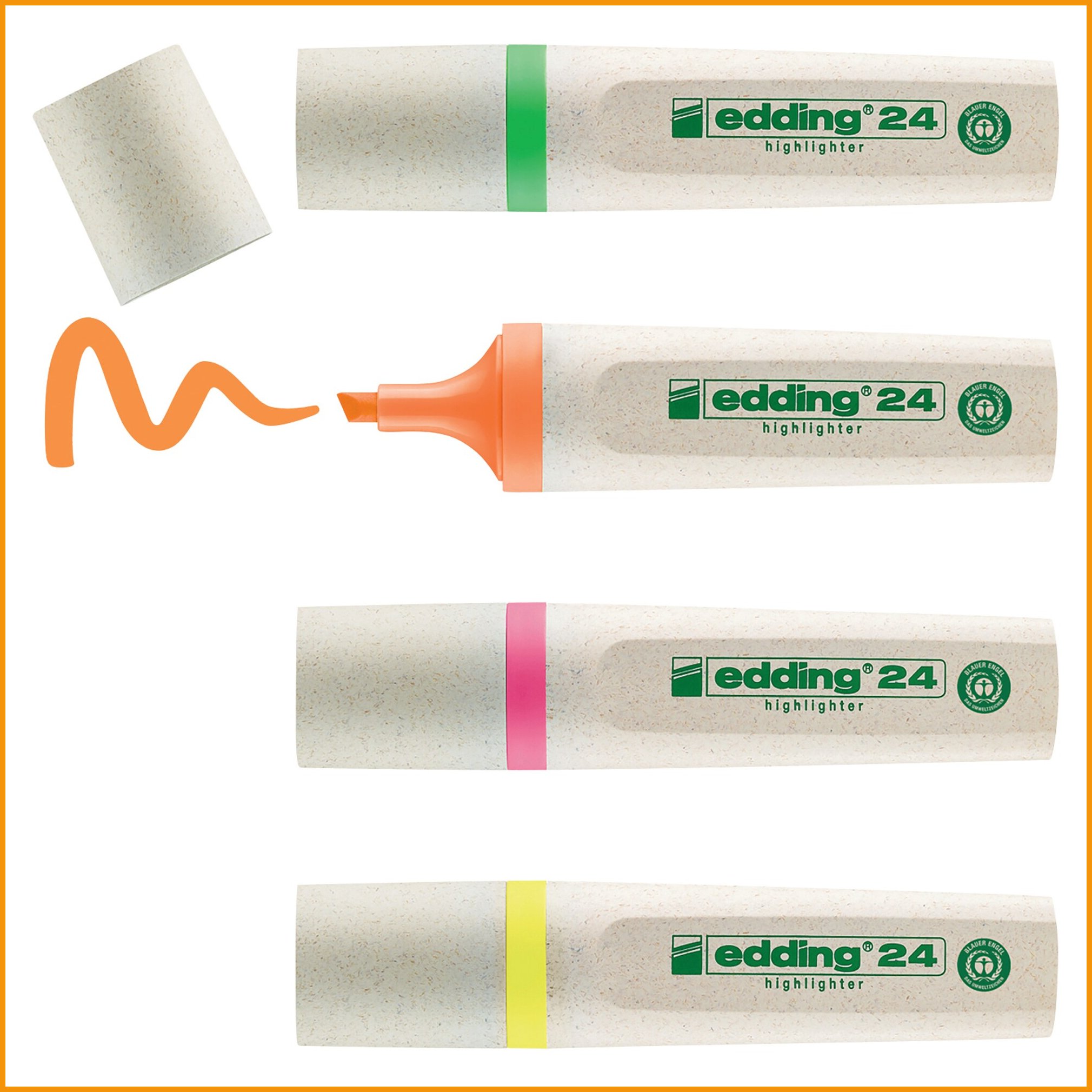 Ympäristöystävällisen edding ecoline -korostuskynän rungosta 70 % on valmistettu kierrätysmateriaaleista. kynän vesipohjainen muste sopii mm. kaikille paperille, faxille ja mustesuihkutulosteille. pakkauksessa on neljä väriä: keltainen, vihreä, pinkki ja oranssi viisto kärki, viivan leveys 2-5 mm. Korostuskynien minimitilaus 1 paketti = 4 kpl. Tukkupakkauksessa 50 kpl.