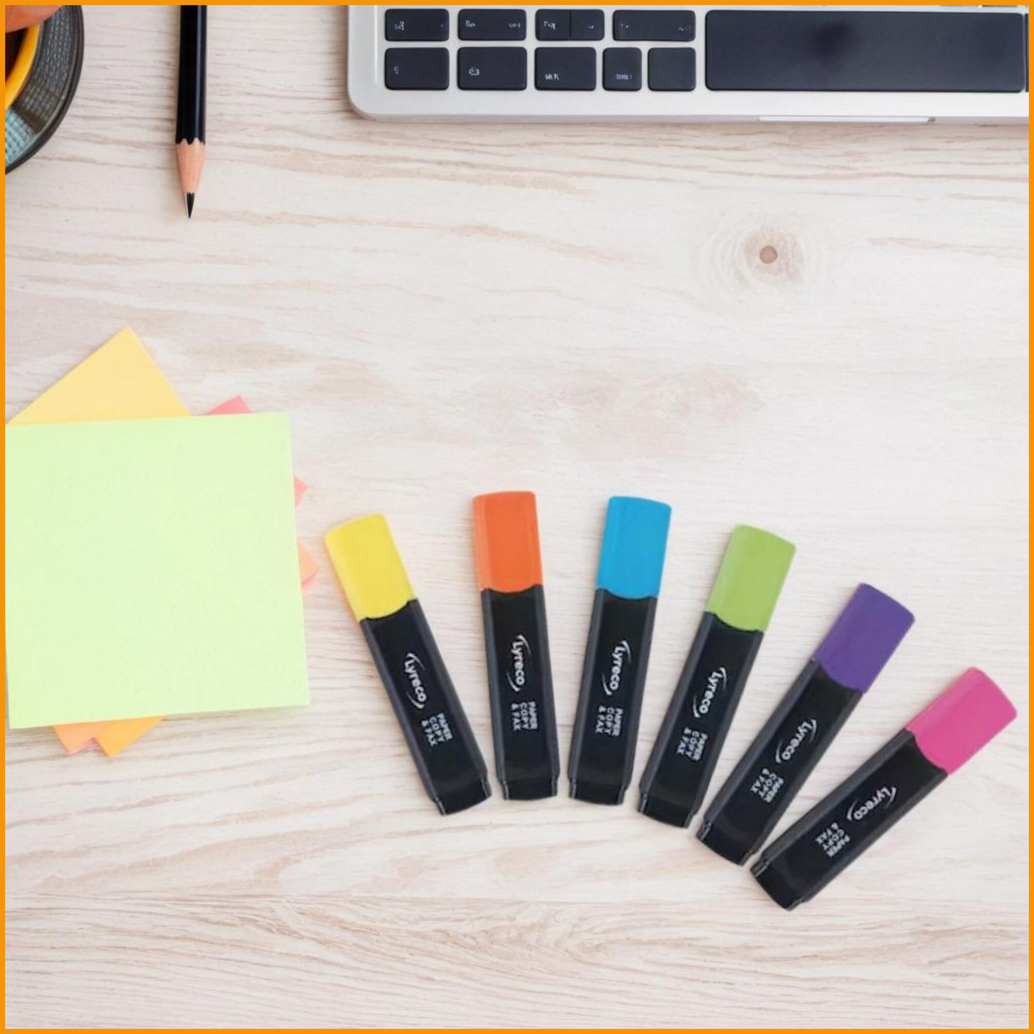 Lyrecon korostuskynällä nostat esiin tekstin avainsanat ja -virkkeet. kynä soveltuu käytettäväksi mm. kaikille paperille, valokopioille ja fakseille. pakkauksessa on kuusi eriväristä kynää: keltainen, vihreä, pinkki, sininen, violetti ja oranssi. viisto kärki, viivan leveys 1–4 mm. Korostuskynien minimitilaus 1 paketti = 6 kpl. Tukkupakkauksessa 40 kpl.Korostuskynät toimitetaan 6 kappaleen erissä.