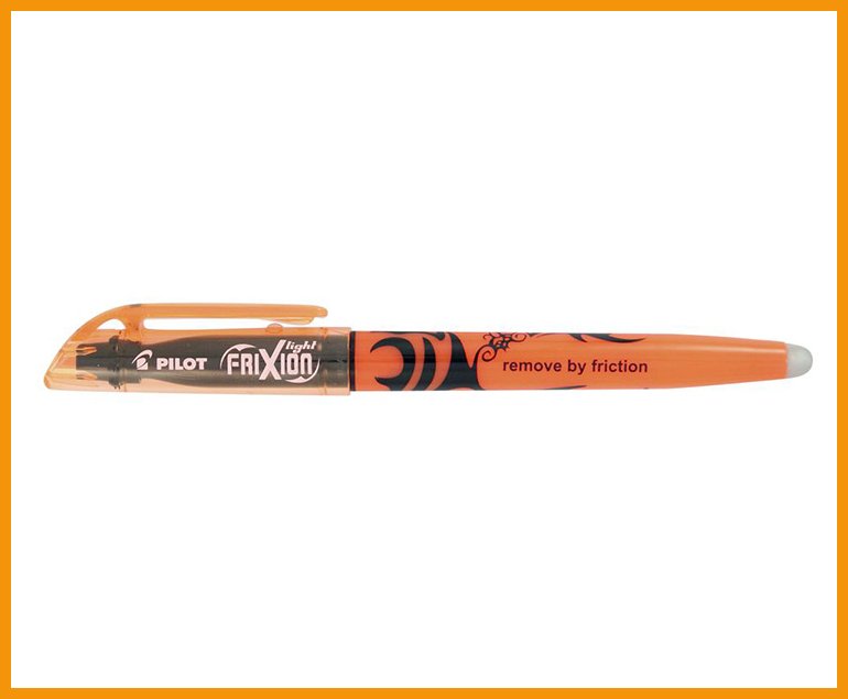 Mikään ei ole ikuista, eikä etenkään Pilot Frixion Light Erasable oranssin korostuskynän jälki. Voit pyyhkiä kynän jäljen kitkan avulla, esimerkiksi kynän päässä olevalla kumilla hankaamalla. Muste irtoaa vielä pitkänkin ajan kuluttua. Kynän runko on musteen värinen.Kynä on valmistettu 50-prosenttisesti kierrätysmateriaaleista.