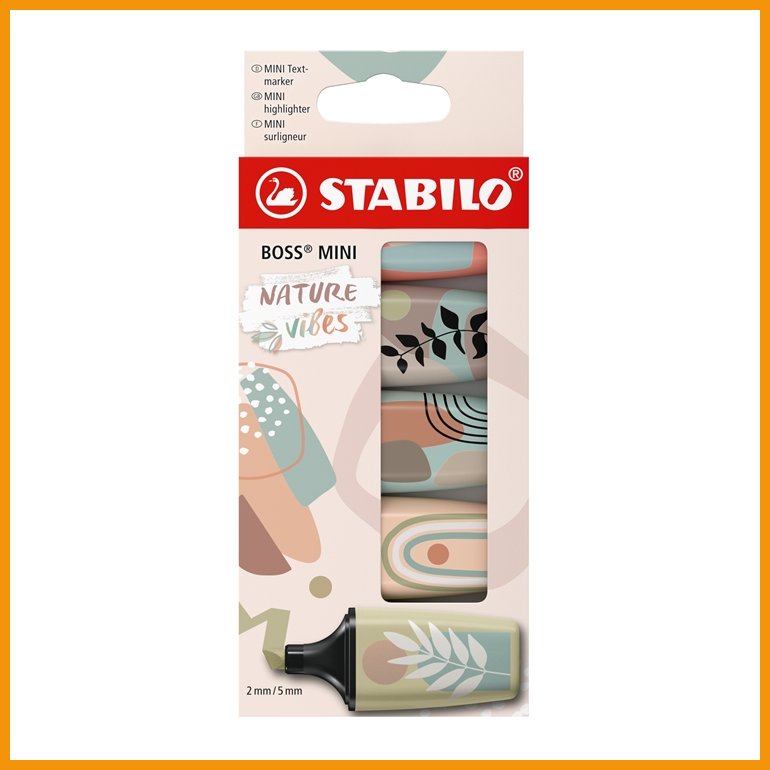 Korostuskynä STABILO BOSS MINI Naturevibes 5 kpl on upea toimistotuote, jonka verkkokauppatilauksen toimitus perille kestää 1-2 päivää. Huomaa, että toimitus on ilmainen yli 140 € hintaisille verkkokauppa ostoksille! Meiltä voit tilata laskulla ja ilman rekisteröitymistä.