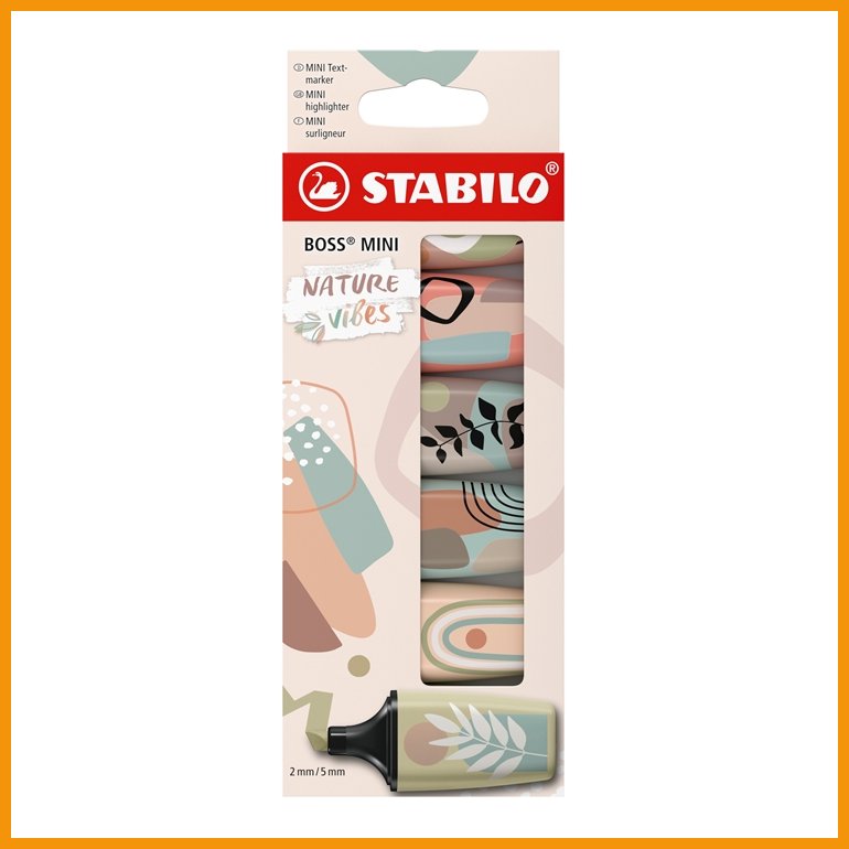 STABILO BOSS MINI Naturevibes on yli 50-vuotiaan BOSS-klassikon pikkusisarus luonnon sävyissä ja kuvioissa. Korkealaatuinen, vesipohjainen ja myrkytön muste juoksee kevyesti viistosta kärjestä, jonka kahdella eri kirjoitusleveydellä sekä alleviivaat että korostat - myös lämpöpaperille. Kynä ei kuivuneljään tuntiin, vaikka korkki unohtuisi auki.Musteen väri: värilajitelma