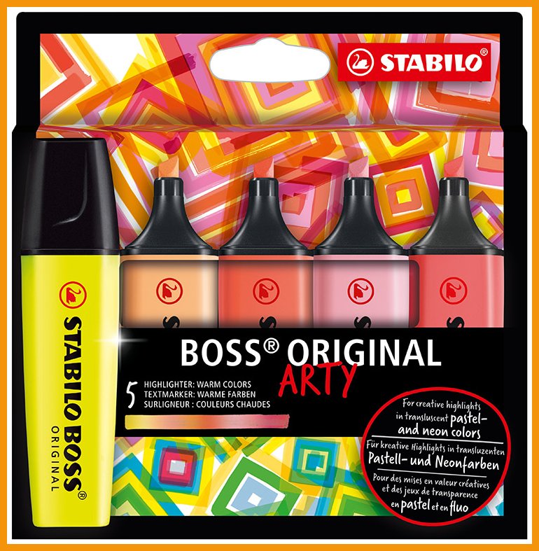 Korostuskynä Stabilo Boss Original Arty lämpimät värit 5 kpl on laadukas toimistotarvike, jonka verkkokaupan tilauksen toimitus kestää 1-2 päivää. Tiedäthän, että Toimitus on ilmainen kaikilla verkkokaupan ostoksilla, joiden hinta on yli 140 €. Meiltä voit tilata laskulla ja ilman rekisteröitymistä.