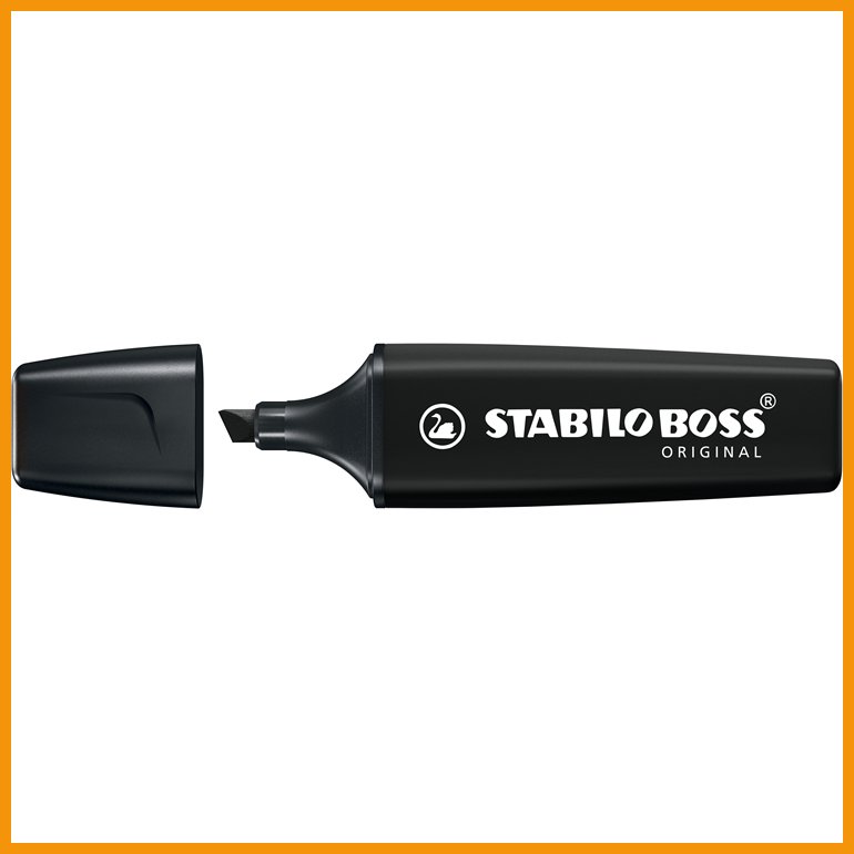 Stabilo Boss Original on Euroopan ostetuin korostuskynä ja klassikko jo vuodesta 1971. Korkealaatuinen, vesipohjainen ja myrkytön muste juoksee kevyesti viistosta kärjestä, jonka kahdella eri kirjoitusleveydellä sekä alleviivaat että korostat - myös lämpöpaperille. Kynä ei kuivu neljään tuntiin, vaikka korkki unohtuisi auki. Mustesäiliö on uudelleentäytettävä.Musteen väri: musta