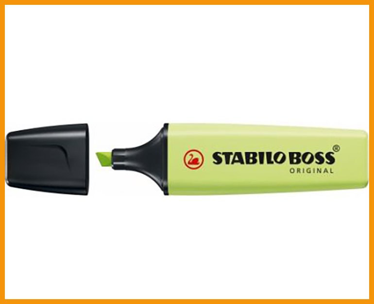 Stabilo Boss Original on Euroopan ostetuin korostuskynä ja klassikko jo vuodesta 1971. Korkealaatuinen, vesipohjainen ja myrkytön muste juoksee kevyesti viistosta kärjestä, jonka kahdella eri kirjoitusleveydellä sekä alleviivaat että korostat - myös lämpöpaperille. Kynä ei kuivu neljään tuntiin, vaikka korkki unohtuisi auki. Mustesäiliö on uudelleentäytettävä.Musteen väri: pastellinlime