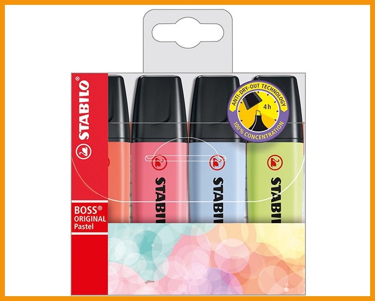 Korostuskynä Stabilo Boss Original pastellivärilaj 4 kpl on korkeatasoinen toimistotarvike, jonka verkkokaupan tilauksen toimitus kestää 1-2 päivää. Muistathan, että toimitus on ilmainen yli 140 € hintaisille verkkokauppa ostoksille! Meiltä voit tilata laskulla ja ilman rekisteröitymistä.