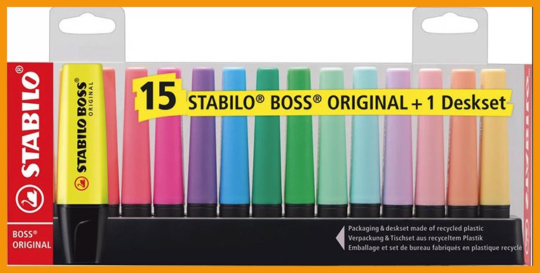 Blisterpakkaukseen käärityssä pöytätelineessä on 15 kpl lajitelma Stabilo Boss -korostuskyniä: 6 pastellisävyä ja 9 fluoresoivaa väriä.