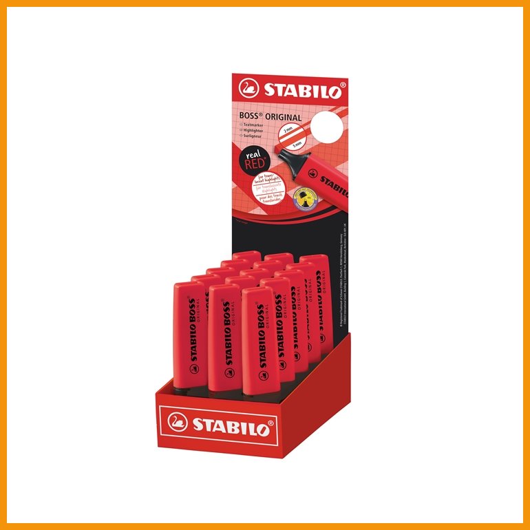 STABILO BOSS ORIGINAL on Euroopan ostetuin punainen korostuskynä ja klassikko jo vuodesta 1971. Nyt kynä on saatavilla myös STABILOnpunaisena REALRED-versiona! Korkealaatuinen, vesipohjainen ja myrkytön muste juoksee kevyesti viistosta kärjestä, jonka kahdella eri kirjoitusleveydellä sekä alleviivaat että korostat, myös lämpöpaperille. Kynä ei kuivu neljään tuntiin, vaikka korkki unohtuisi auki.Musteen väri: STABILOn punainen