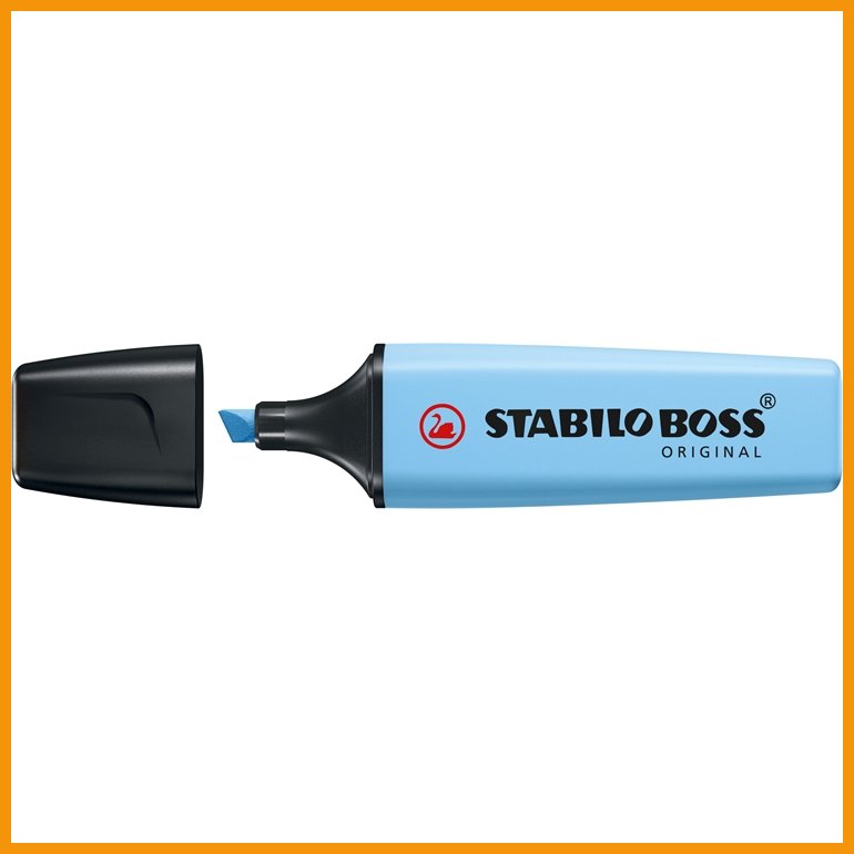 STABILO BOSS ORIGINAL on Euroopan ostetuin korostuskynä ja klassikko jo vuodesta 1971. Korkealaatuinen, vesipohjainen ja myrkytön muste juoksee kevyesti viistosta kärjestä, jonka kahdella eri kirjoitusleveydellä sekä alleviivaat että korostat - myös lämpöpaperille. Kynä ei kuivu neljään tuntiin, vaikka korkki unohtuisi auki.Musteen väri: tuulensininen