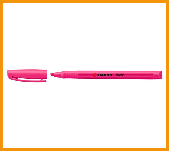 Stabilo Flash on kapearunkoinen pinkki korostuskynä, jolla teet merkintöjä helposti myös pienemmille fonteille. Korkealaatuinen, vesipohjainen, myrkytön ja fluoresoiva muste juoksee kevyesti viistosta kärjestä, jonka kahdella eri kirjoitusleveydellä sekä alleviivaat että korostat - myös lämpöpaperille. Kynä ei kuivu neljään tuntiin, vaikka korkki unohtuisi auki. Suojakorkissa on taskuklipsi.Musteen väri: pinkki