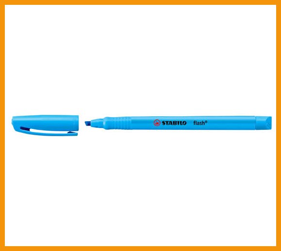 Stabilo Flash on kapearunkoinen sininen korostuskynä, jolla teet merkintöjä helposti myös pienemmille fonteille. Korkealaatuinen, vesipohjainen, myrkytön ja fluoresoiva muste juoksee kevyesti viistosta kärjestä, jonka kahdella eri kirjoitusleveydellä sekä alleviivaat että korostat - myös lämpöpaperille. Kynä ei kuivu neljään tuntiin, vaikka korkki unohtuisi auki. Suojakorkissa on taskuklipsi.Musteen väri: sininen
