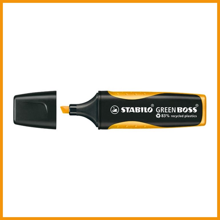 Stabilo Green Boss on kierrätysmuovista valmistettu versio Euroopan ostetuimmasta oranssista korostuskynästä. Korkealaatuinen, vesipohjainen, myrkytön ja fluoresoiva muste juoksee kevyesti viistosta kärjestä, jonka kahdella eri kirjoitusleveydellä sekä alleviivaat että korostat - myös lämpöpaperille. Kynä ei kuivu neljään tuntiin, vaikka korkki unohtuisi auki.Kynän muoviosien valmistuksessa on käytetty 83 % kierrätysmuovia ja mustesäiliö on uudelleentäytettävä.
