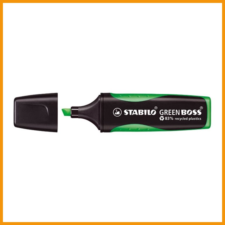 Stabilo Green Boss on kierrätysmuovista valmistettu versio Euroopan ostetuimmasta vihreästä korostuskynästä. Korkealaatuinen, vesipohjainen, myrkytön ja fluoresoiva muste juoksee kevyesti viistosta kärjestä, jonka kahdella eri kirjoitusleveydellä sekä alleviivaat että korostat - myös lämpöpaperille. Kynä ei kuivu neljään tuntiin, vaikka korkki unohtuisi auki.Kynän muoviosien valmistuksessa on käytetty 83 % kierrätysmuovia ja mustesäiliö on uudelleentäytettävä.
