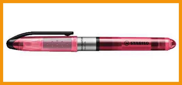 Stabilo Navigator pinkin korostuskynän pyöreä ja kapea runko kumisine otepintoineen muistuttavat kirjoitustuntumaltaan tavallista kuulakärkikynää. Korkealaatuinen, vesipohjainen, myrkytön ja fluoresoiva muste juoksee kevyesti viistosta kärjestä, jonka kahdella eri kirjoitusleveydellä sekä alleviivaat että korostat - myös lämpöpaperille.Näet jäljellä olevan musteen määrän suoraan läpikuultavan rungon läpi. Kynä ei kuivu neljään tuntiin, vaikka korkki unohtuisi auki. Suojakorkissa on taskuklipsi.