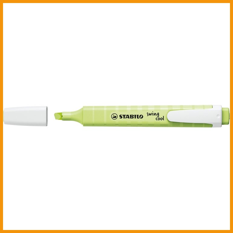STABILO swing cool on tavanomaista korostuskynää kapeampi ja sirompi. Korkealaatuinen, vesipohjainen ja myrkytön muste juoksee kevyesti viistosta kärjestä, jonka kahdella eri kirjoitusleveydellä sekä alleviivaat että korostat. Kynä ei kuivu neljään tuntiin, vaikka ventiloitu korkki unohtuisi auki. Kynässä on myös taskuklipsi.Musteen väri: lime