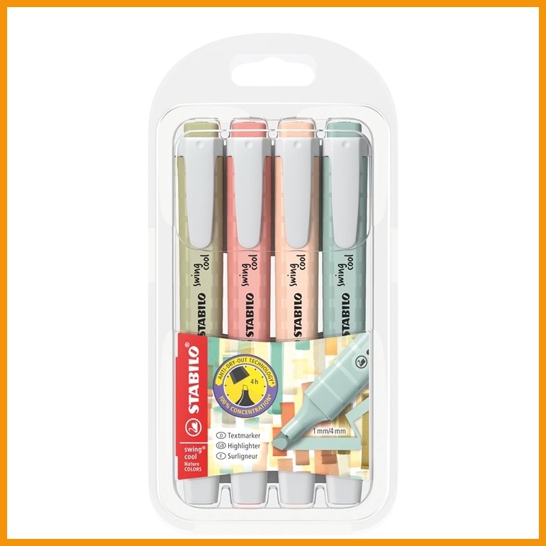 Korostuskynä STABILO swing cool NatureCOLORS 4 kpl on tasokas toimistotuote, jonka verkkokaupan tilauksen toimitus kestää 1-2 päivää. Huomaa, että toimitus on ilmainen yli 140 € hintaisille verkkokauppa ostoksille! Meiltä voit tilata laskulla ja ilman rekisteröitymistä.