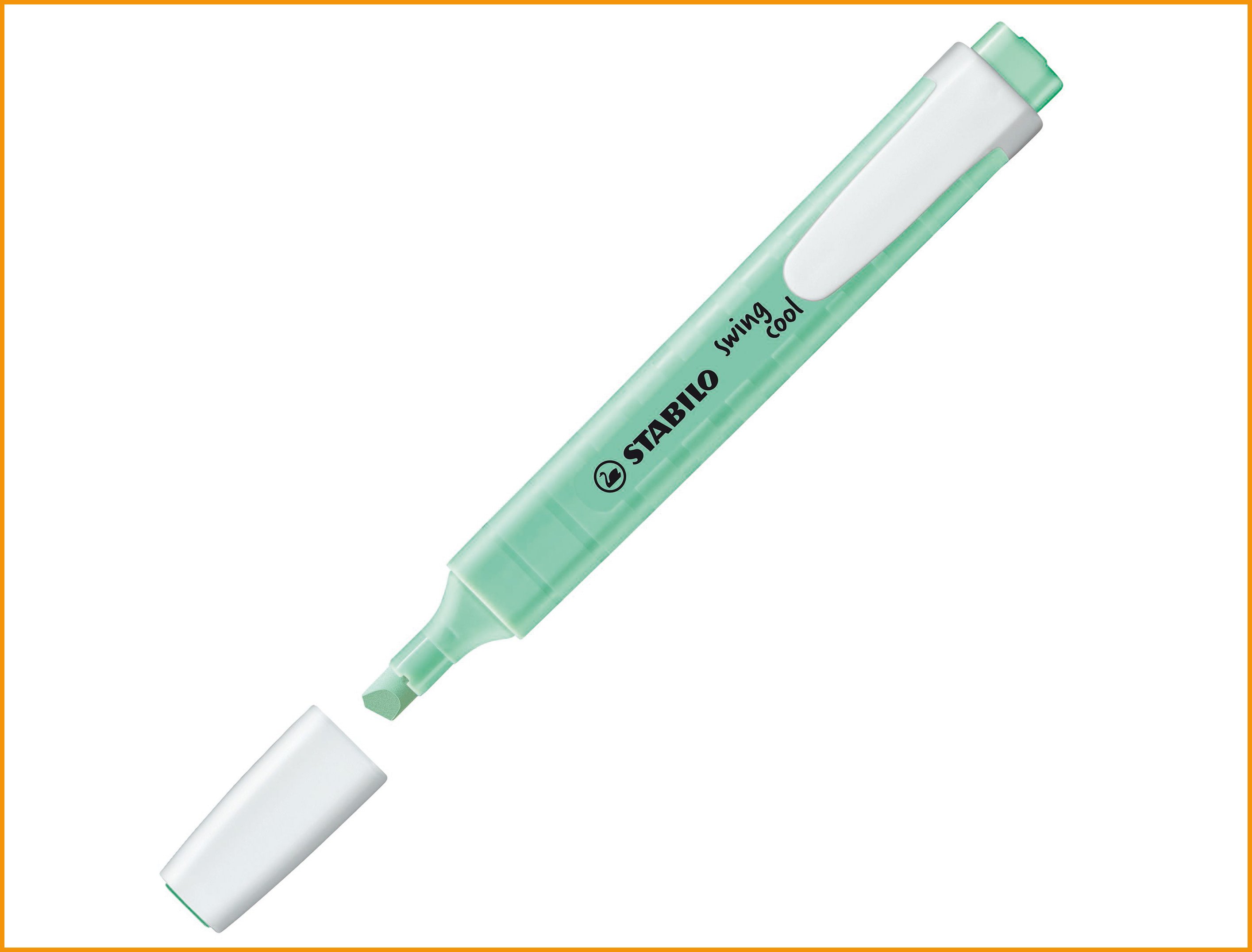 Stabilo Swing Cool on tavanomaista korostuskynää kapeampi ja sirompi. Korkealaatuinen, vesipohjainen ja myrkytön muste juoksee kevyesti viistosta kärjestä, jonka kahdella eri kirjoitusleveydellä sekä alleviivaat että korostat. Kynä ei kuivu neljään tuntiin, vaikka ventiloitu korkki unohtuisi auki. Kynässä on myös taskuklipsi.Musteen väri: pastellinminttu