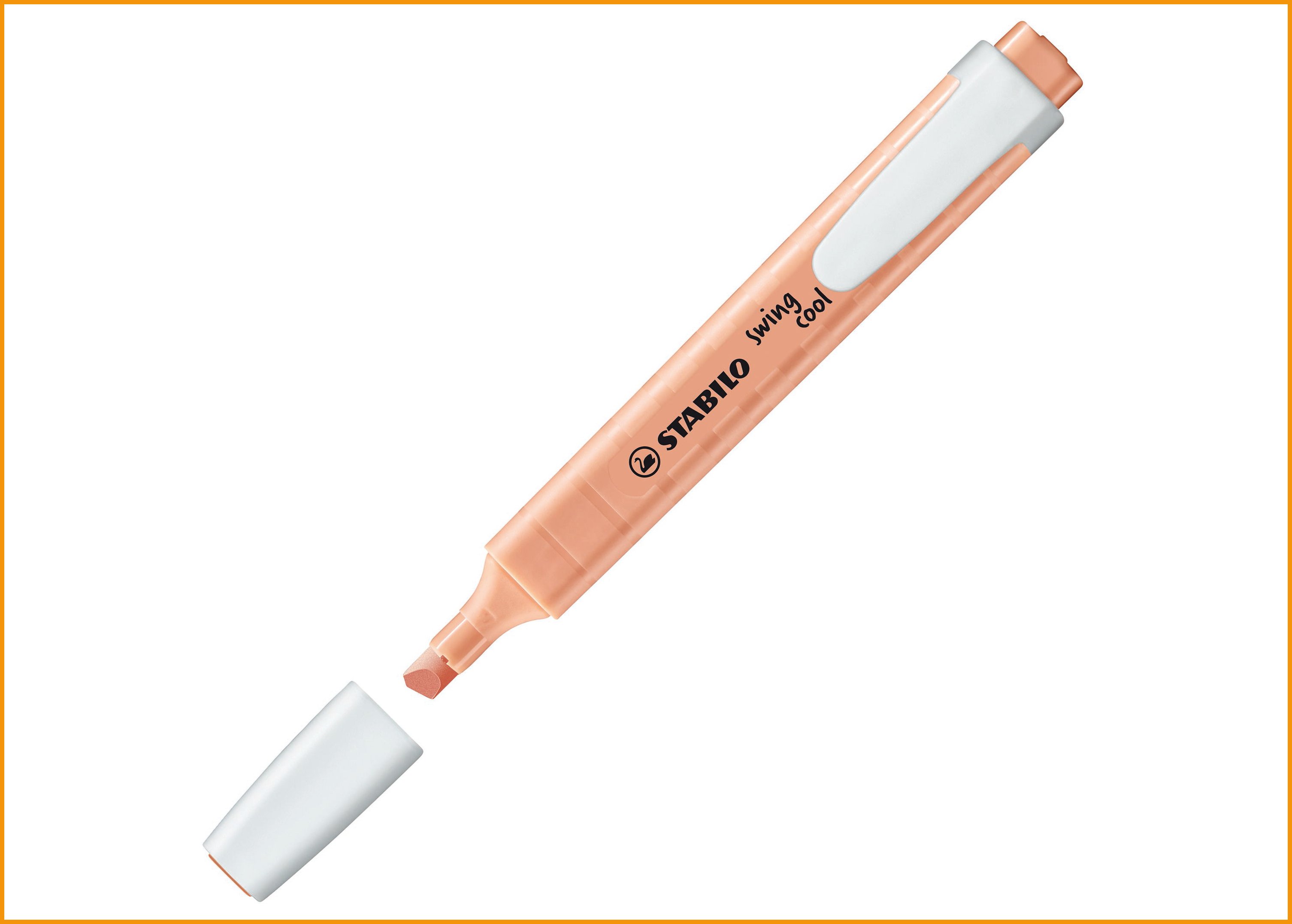 Stabilo Swing Cool on tavanomaista korostuskynää kapeampi ja sirompi. Korkealaatuinen, vesipohjainen ja myrkytön muste juoksee kevyesti viistosta kärjestä, jonka kahdella eri kirjoitusleveydellä sekä alleviivaat että korostat. Kynä ei kuivu neljään tuntiin, vaikka ventiloitu korkki unohtuisi auki. Kynässä on myös taskuklipsi.Musteen väri: pastellinpersikka