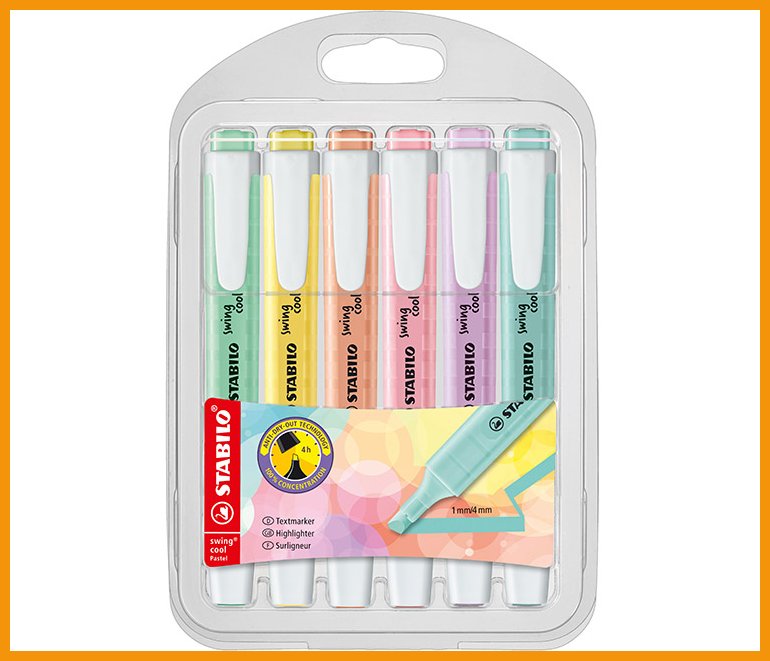 Stabilo Swing Cool on tavanomaista korostuskynää kapeampi ja sirompi. Korkealaatuinen, vesipohjainen ja myrkytön muste juoksee kevyesti viistosta kärjestä, jonka kahdella eri kirjoitusleveydellä sekä alleviivaat että korostat. Kynä ei kuivu neljään tuntiin, vaikka korkki unohtuisi auki. Kynässä on myös taskuklipsi.Musteen väri: pastellivärilajitelma