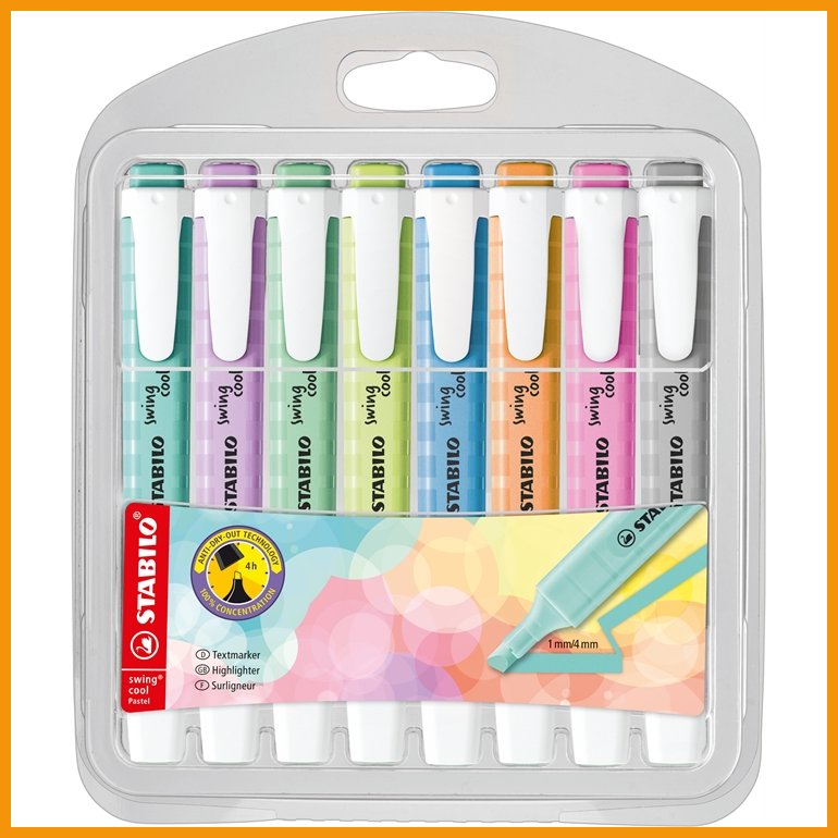 Stabilo Swing Cool on tavanomaista korostuskynää kapeampi ja sirompi. Korkealaatuinen, vesipohjainen ja myrkytön muste juoksee kevyesti viistosta kärjestä, jonka kahdella eri kirjoitusleveydellä sekä alleviivaat että korostat. Kynä ei kuivu neljään tuntiin, vaikka korkki unohtuisi auki. Kynässä on myös taskuklipsi.Musteen väri: pastellivärilajitelma