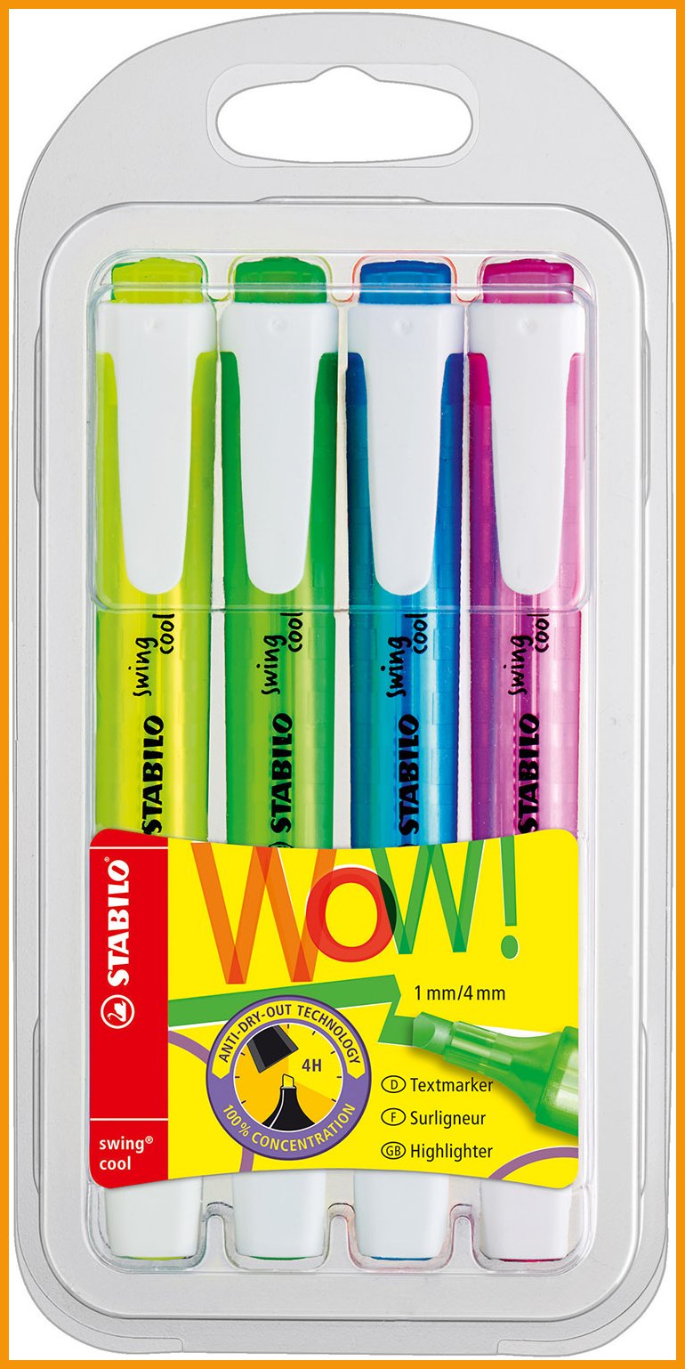 Stabilo Swing Cool on tavanomaista korostuskynää kapeampi ja sirompi. Korkealaatuinen, vesipohjainen ja myrkytön fluoresoiva muste juoksee kevyesti viistosta kärjestä, jonka kahdella eri kirjoitusleveydellä sekä alleviivaat että korostat. Kynä ei kuivu neljään tuntiin, vaikka korkki unohtuisi auki. Kynässä on myös taskuklipsi.Musteen väri: keltainen, sininen, vihreä ja pinkki