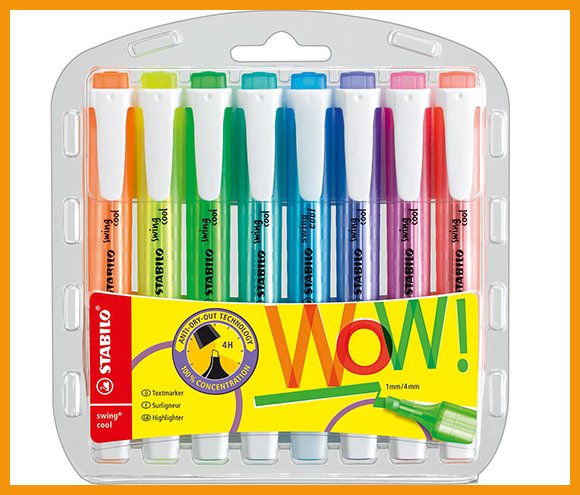 Stabilo Swing Cool on tavanomaista korostuskynää kapeampi ja sirompi. Korkealaatuinen, vesipohjainen ja myrkytön fluoresoiva muste juoksee kevyesti viistosta kärjestä, jonka kahdella eri kirjoitusleveydellä sekä alleviivaat että korostat. Kynä ei kuivu neljään tuntiin, vaikka korkki unohtuisi auki. Kynässä on myös taskuklipsi.Musteen väri: keltainen, oranssi, vihreä, turkoosi, sininen, laventeli, pinkki ja punainen