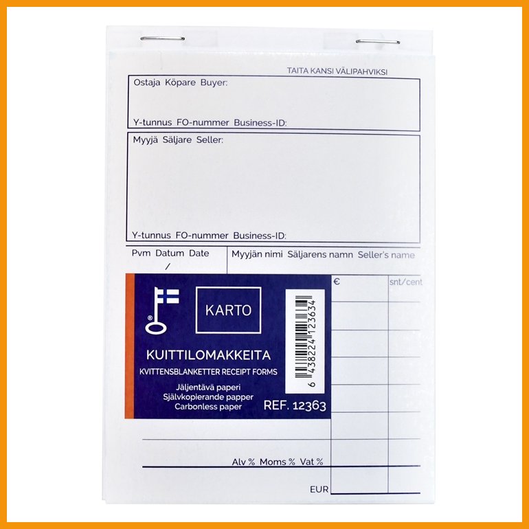 Kuittilehtiössä on 50 numeroitua kuittia jäljentävällä paperilla.Kotimaisella tuotteella on Avainlippu.
