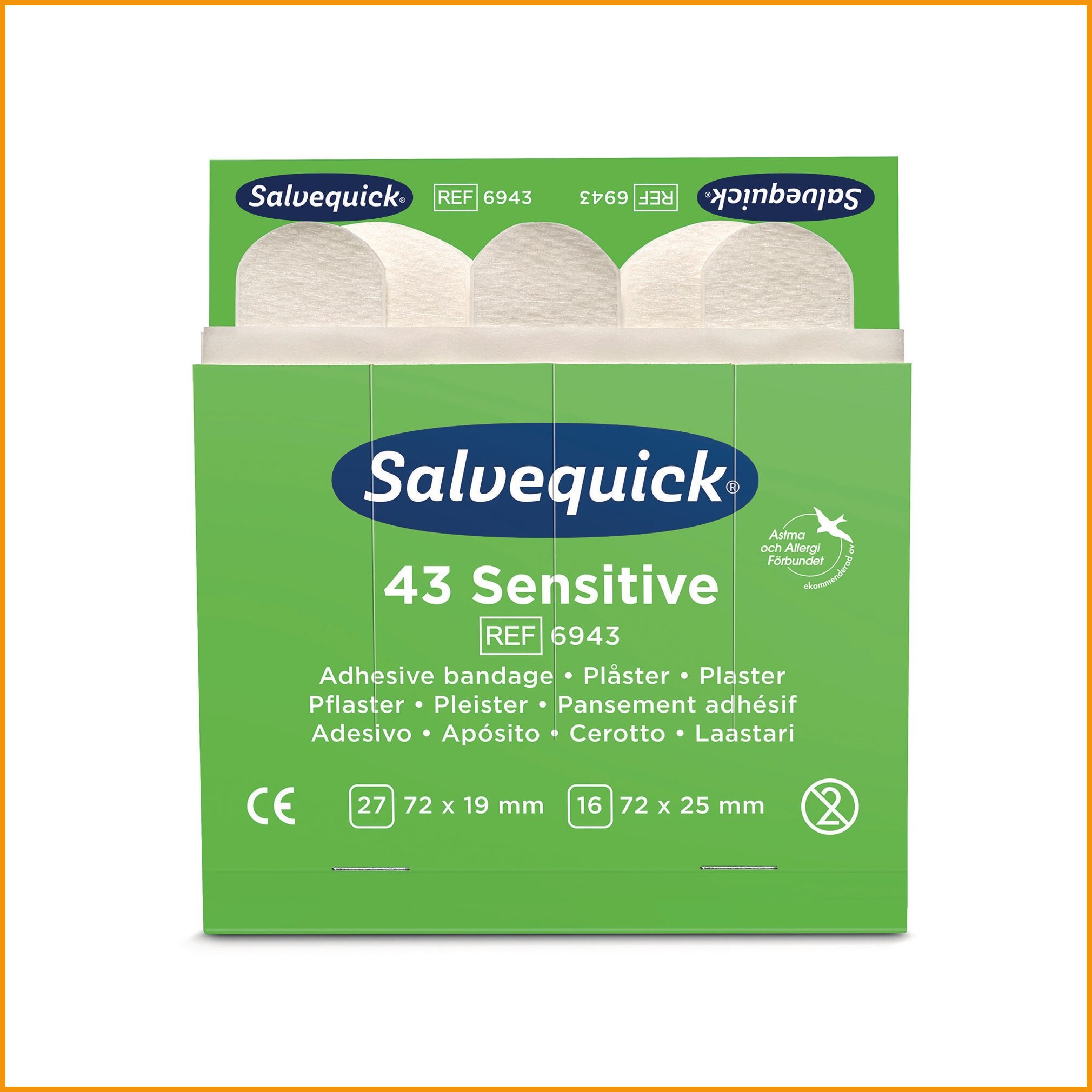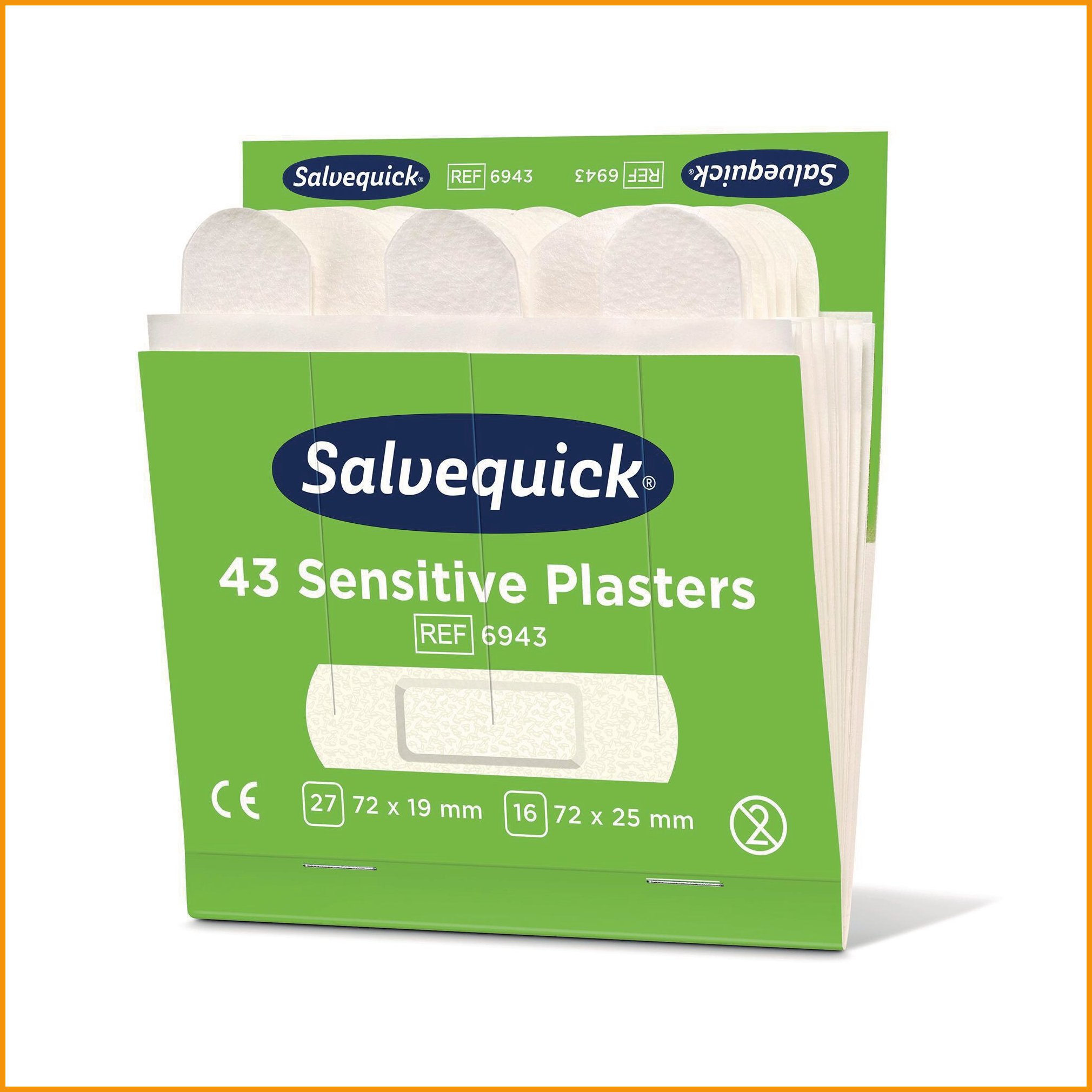 Kuitukangaslaastari Sensitive Salvequick 6943 on vettähylkiviä ja ihoystävillinen laastari. Yksi rasia sisältää 6 täyttöpakkausta ja yksi täyttöpakkaus sisältää 43 laastaria (27 kpl 72 x 19 mm ja 16 kpl 72 x 25 mm). Eli yhdessä rasiassa on 258 allergiatestattua laastaria. Tämä on täyttöpakkaus Salvequick laastariautomaattiin, voidaan käyttää myös sellaisenaan.
