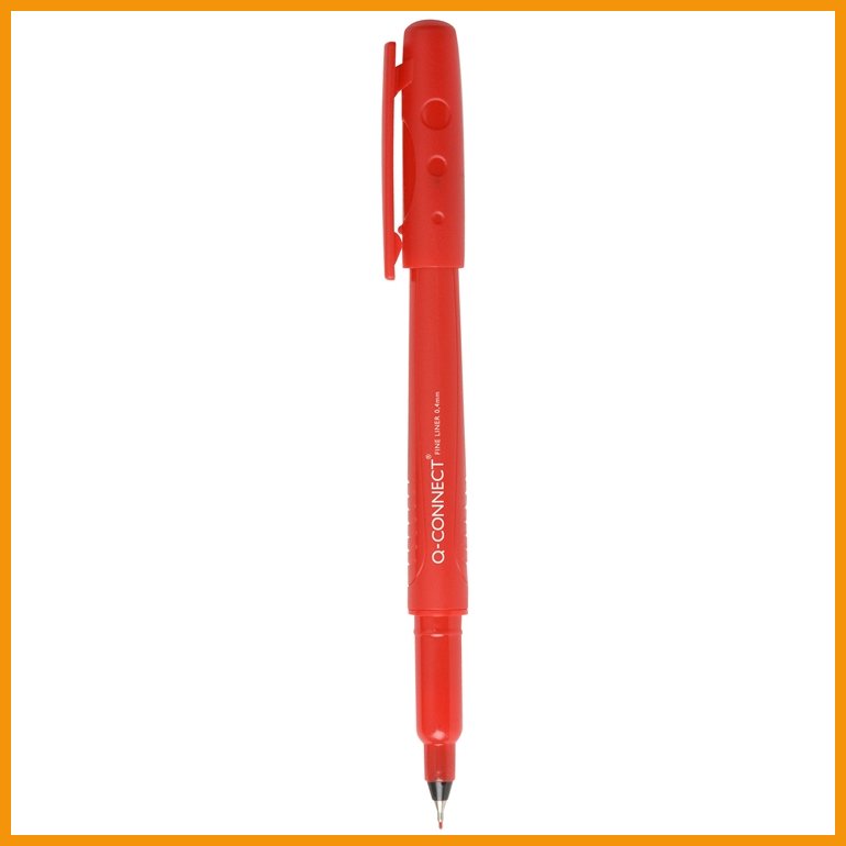 Q-Connect Fineliner on kirjoittamiseen, luonnosteluun ja piirtämiseen sopiva kuitukärkikynä, jossa on vesipohjainen muste, kiinteällä muoviklipsillä varustettu korkki ja käyttöä kestävä metallivahvisteinen kärki. 350 metrin kirjoittamiseen riittävä muste ei kuivu, vaikka korkki jäisi auki kahdeksi päiväksi.Kynän musteen värinen polypropeenirunko on valmistettu vähintään 50-prosenttisesti GRS-serfitioidusta kierrätysmuovista.