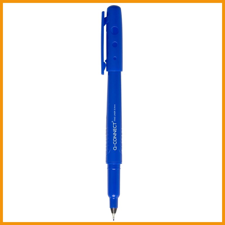 Q-Connect Fineliner on kirjoittamiseen, luonnosteluun ja piirtämiseen sopiva kuitukärkikynä, jossa on vesipohjainen muste, kiinteällä muoviklipsillä varustettu korkki ja käyttöä kestävä metallivahvisteinen kärki. 350 metrin kirjoittamiseen riittävä muste ei kuivu, vaikka korkki jäisi auki kahdeksi päiväksi.Kynän musteen värinen polypropeenirunko on valmistettu vähintään 50-prosenttisesti GRS-serfitioidusta kierrätysmuovista.