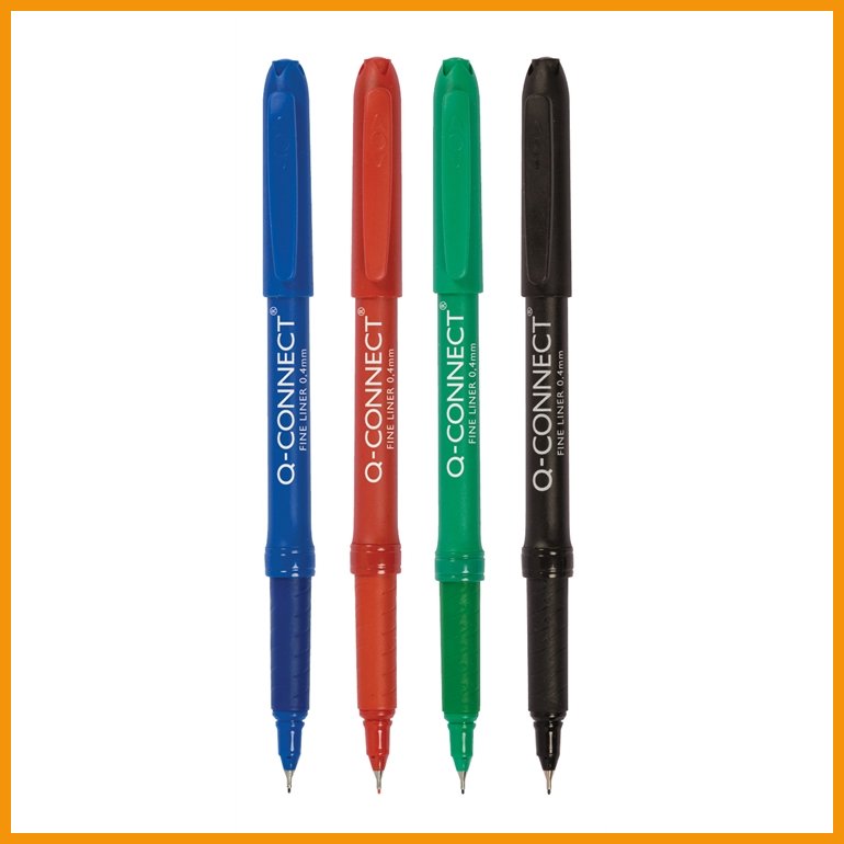 Q-Connect Fineliner on kirjoittamiseen, luonnosteluun ja piirtämiseen sopiva kuitukärkikynä, jossa on vesipohjainen muste, kiinteällä muoviklipsillä varustettu korkki ja käyttöä kestävä metallivahvisteinen kärki. 350 metrin kirjoittamiseen riittävä muste ei kuivu, vaikka korkki jäisi auki kahdeksi päiväksi.Kynän musteen värinen polypropeenirunko on valmistettu vähintään 50-prosenttisesti GRS-serfitioidusta kierrätysmuovista.