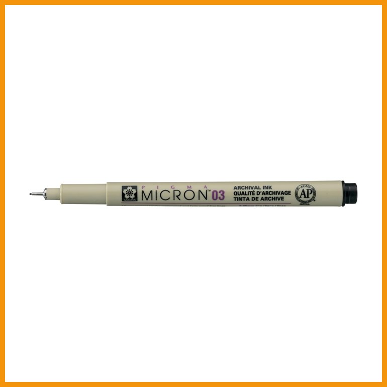 Sakura Micron 03 on mm. tekniseen piirtämiseen soveltuva kuitukärkikynä. Patentoitu erikoispigmenttimuste on arkistokelpoista, happovapaata ja sekä veden- että valonkestävää eikä vuoda paperin läpi.Musteen väri: musta
