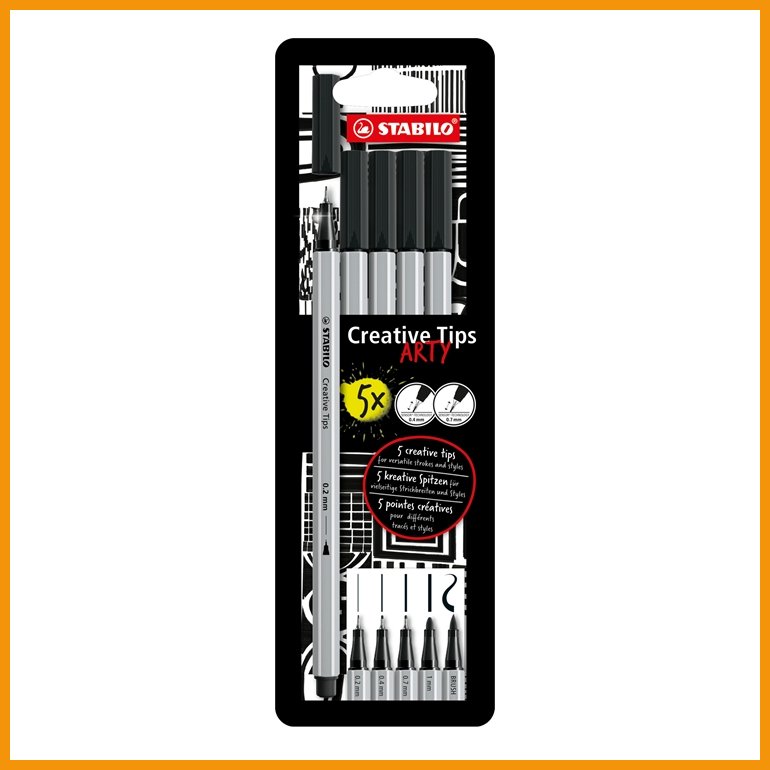 STABILO Creative Tips Arty -sarjan kuitukärkikynät eivät rajoita luovuuttasi. Ne sopivat hyvin kaikenlaiseen tekemiseen kirjoittamisesta piirtämiseen ja varjostamiseen.Pakkauksessa on viisi erilaista kynää moninaisiin käyttötarkoituksiin: ohutkärkinen 0,2 mm, joustokärkiset 0,4 ja 0,7 mm, huopakärkinen 1 mm ja sivellinkärkinen kynä. Vesipohjainen muste soveltuu myös vesiväritykseen. Korkki on ventiloitu.