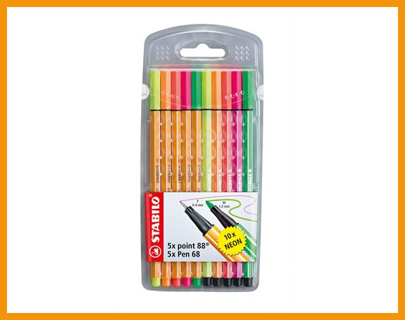 Stabilon neonpakkauksessa on lajitelma Pen 68-, ja Point 88 -kuitukärkikyniä neonväreissä. Molempia on 5 kpl.Stabilo Pen 68 soveltuu niin kirjoittamiseen, piirtämiseen kuin vesivärikäyttöönkin. Vesipohjainen ja hajuton muste saa aikaan kirkkaat värit, ja kynän erityisen vankka kärki ei taivu tai rispaannu liian helposti. Kynä ei kuivu 24 tuntiin, vaikka unohtaisit korkin auki. Korkki on ventiloitu. Viivan leveys on noin 1,0 mm.