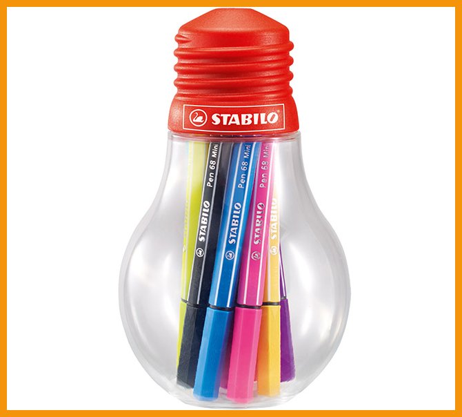 Lajitelmassa on 12 eriväristä kynää vinkeässä hehkulampun mallisessa pakkauksessa.
