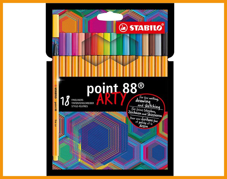 STABILO Point 88 on ajaton klassikko, jonka valkoiset raidat keltaisella kuusikulmaisella rungolla tunnistat varmasti. Kuitukärkikynä soveltuu yhtä hyvin niin kirjoittamiseen kuin piirtämiseenkin. Metalliseen vaippaan kiedottu kapea ja tarkka kärki sopii hyvin mm. viivottimien kanssa toimimiseen. Muste on vesiliukoista, ja kynä ei kuivu 2-3 päivään, vaikka unohtaisit korkin auki. Korkki on ventiloitu.ISCC PLUS -sertifioidun kynän runko ja korkki on valmistettu vähintään 90-prosenttisesti biopohjaisesta muovista, jota tuotetaan uusiutuvista raaka-aineista.
