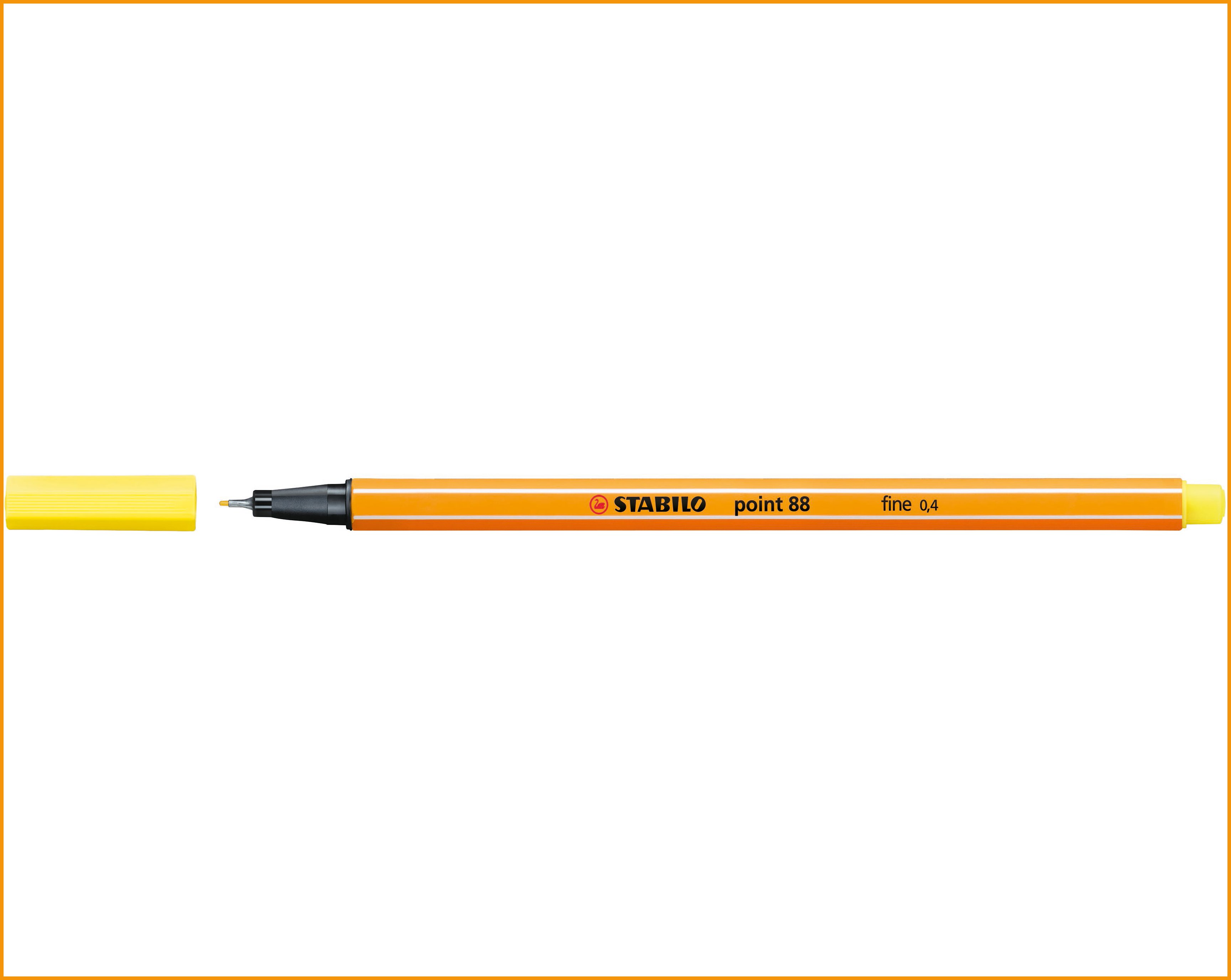 STABILO Point 88 on ajaton klassikko, jonka valkoiset raidat keltaisella kuusikulmaisella rungolla tunnistat varmasti. Kuitukärkikynä soveltuu yhtä hyvin niin kirjoittamiseen kuin piirtämiseenkin. Metalliseen vaippaan kiedottu kapea ja tarkka kärki sopii hyvin mm. viivottimien kanssa toimimiseen. Muste on vesiliukoista, ja kynä ei kuivu 2-3 päivään, vaikka unohtaisit korkin auki. Korkki on ventiloitu.ISCC PLUS -sertifioidun kynän runko ja korkki on valmistettu vähintään 90-prosenttisesti biopohjaisesta muovista, jota tuotetaan uusiutuvista raaka-aineista.