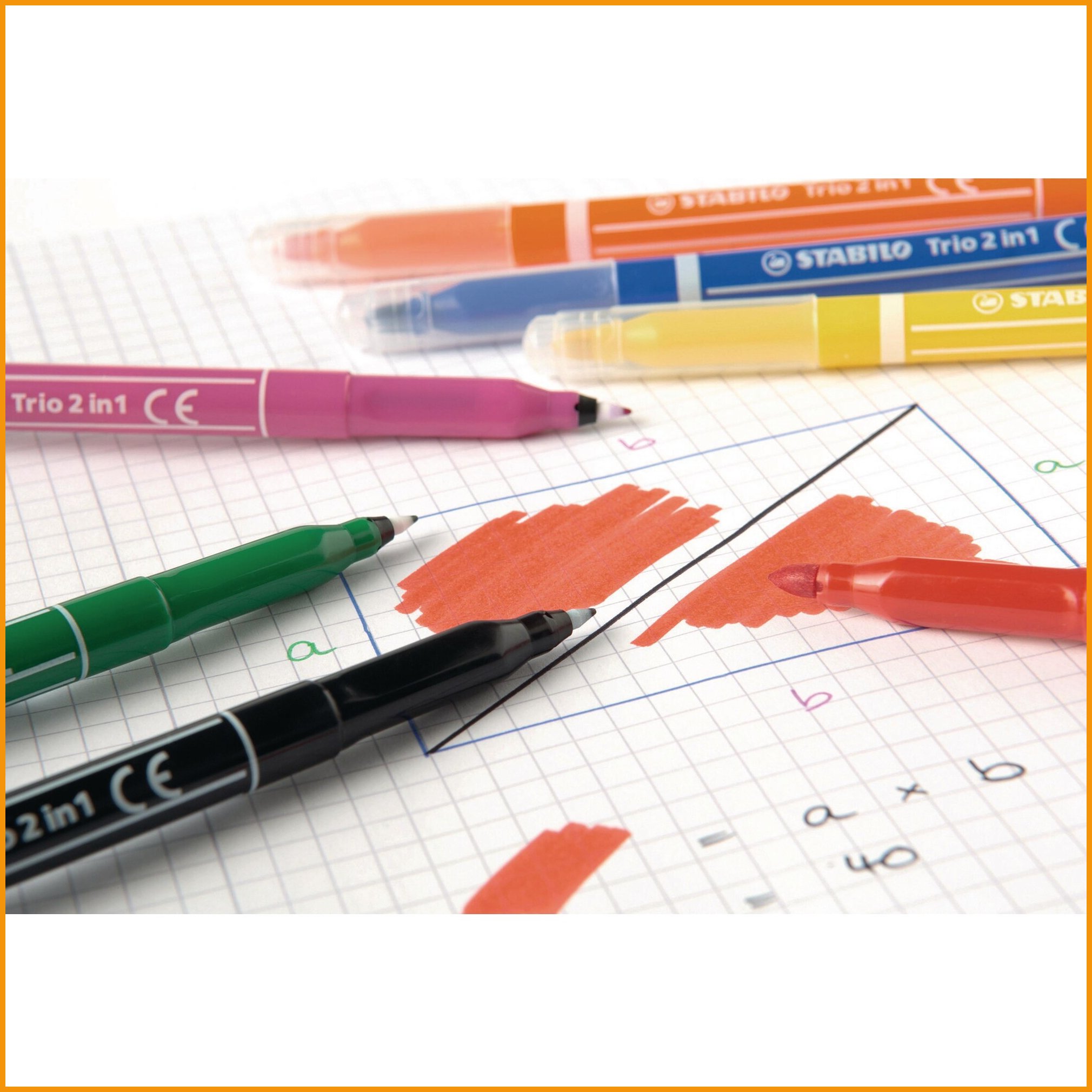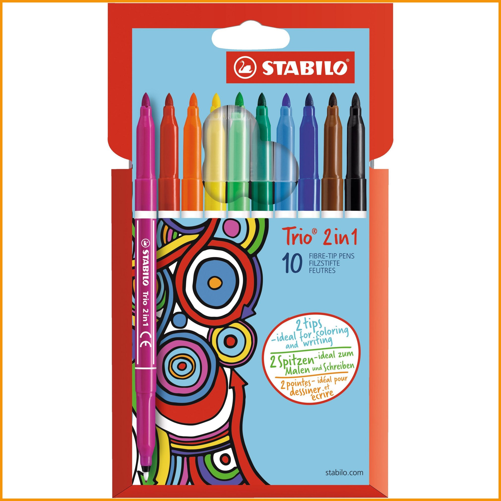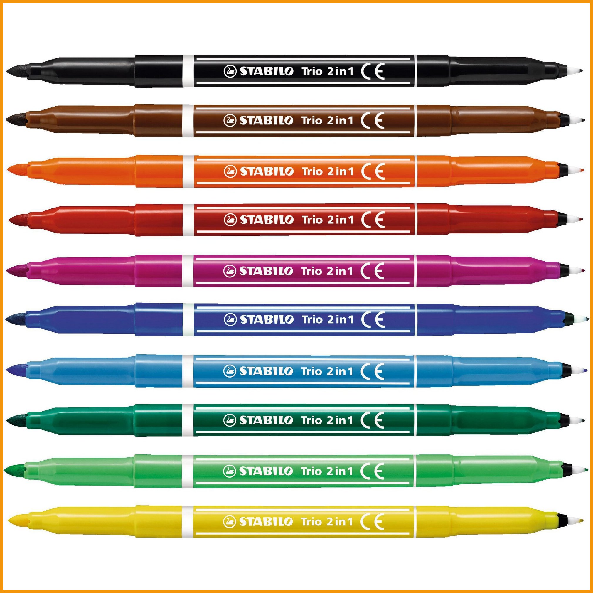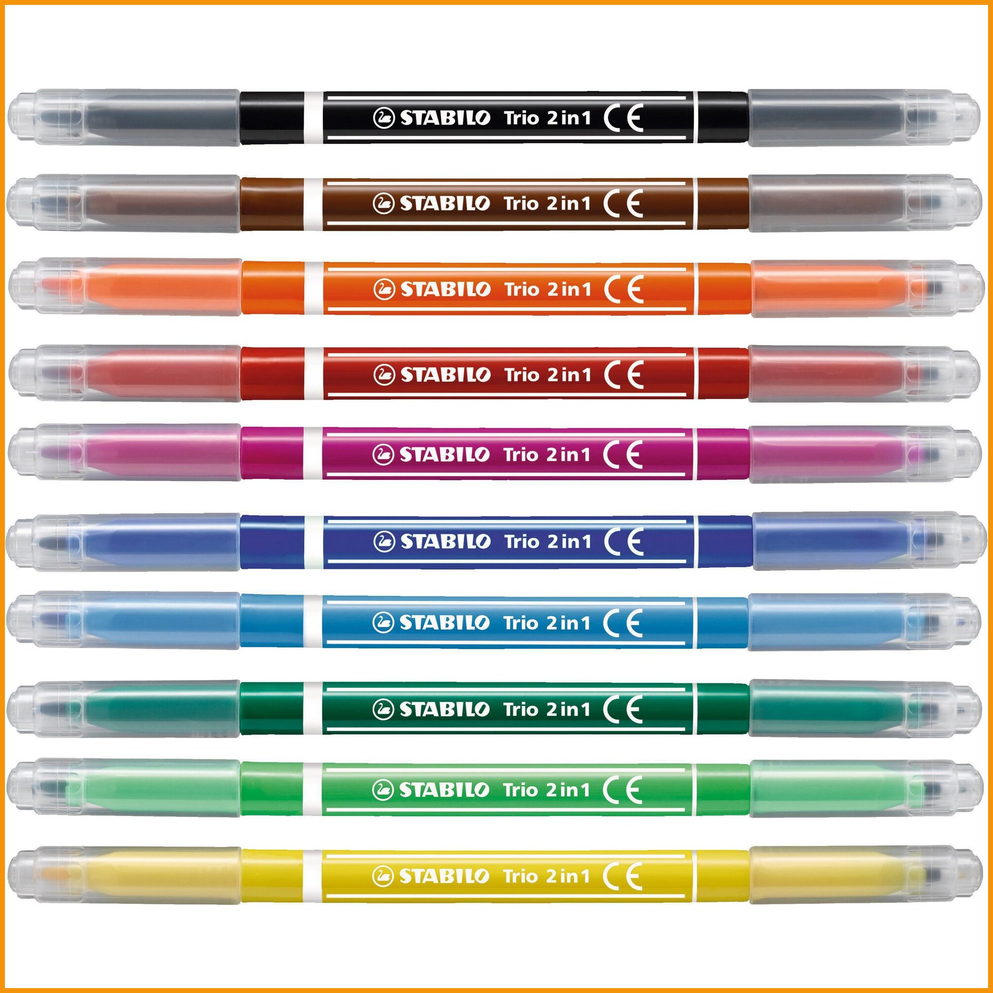 Stabilo trio 2in1 -kuitukärkikynässä on kaksi päätä: ohut pää (0,5 mm) kirjoittamista varten ja leveä pää (2,0 mm) värittämiseen. musteen voi pestä pois vedellä. lajitelmassa on 10 eri väriä. myyntierä: 1 pkt / 10 pkt.Kuitukärkikynät toimitetaan 10 kappaleen erissä.